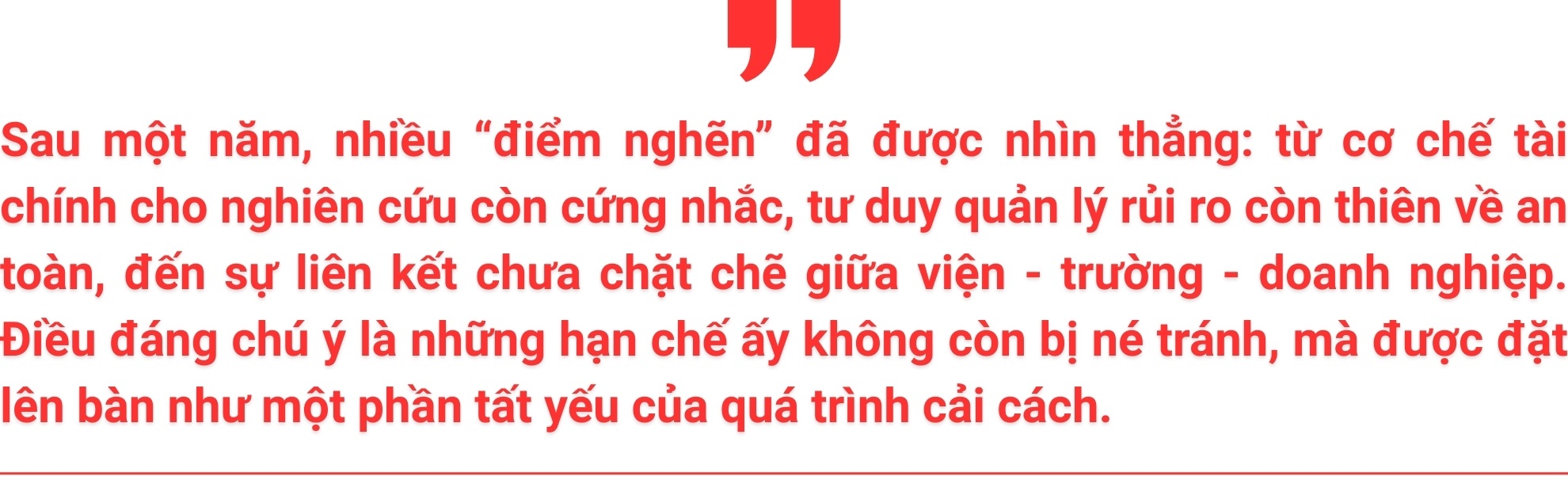 Sau một năm, nhiều "điểm nghẽn" đã được nhìn thẳng: từ cơ chế tài chính cho nghiên cứu còn cứng nhắc, tư duy quản lý rủi ro còn thiên về an toàn, đến sự liên kết chưa chặt chẽ giữa viện – trường – doanh nghiệp. Điều đáng chú ý là những hạn chế ấy không còn bị né tránh, mà được đặt lên bàn như một phần tất yếu của quá trình cải cách.