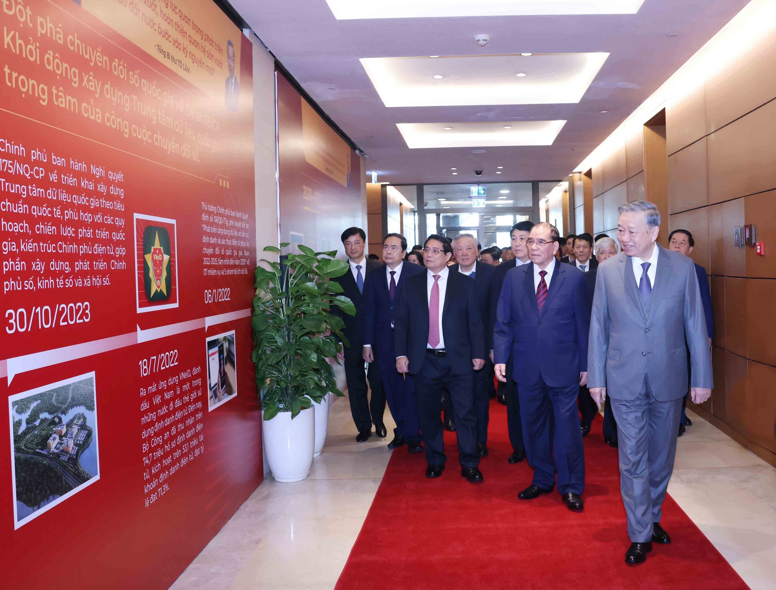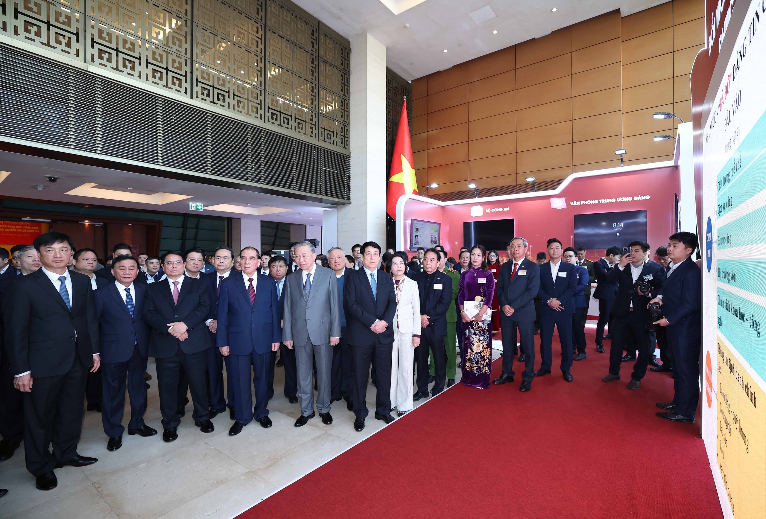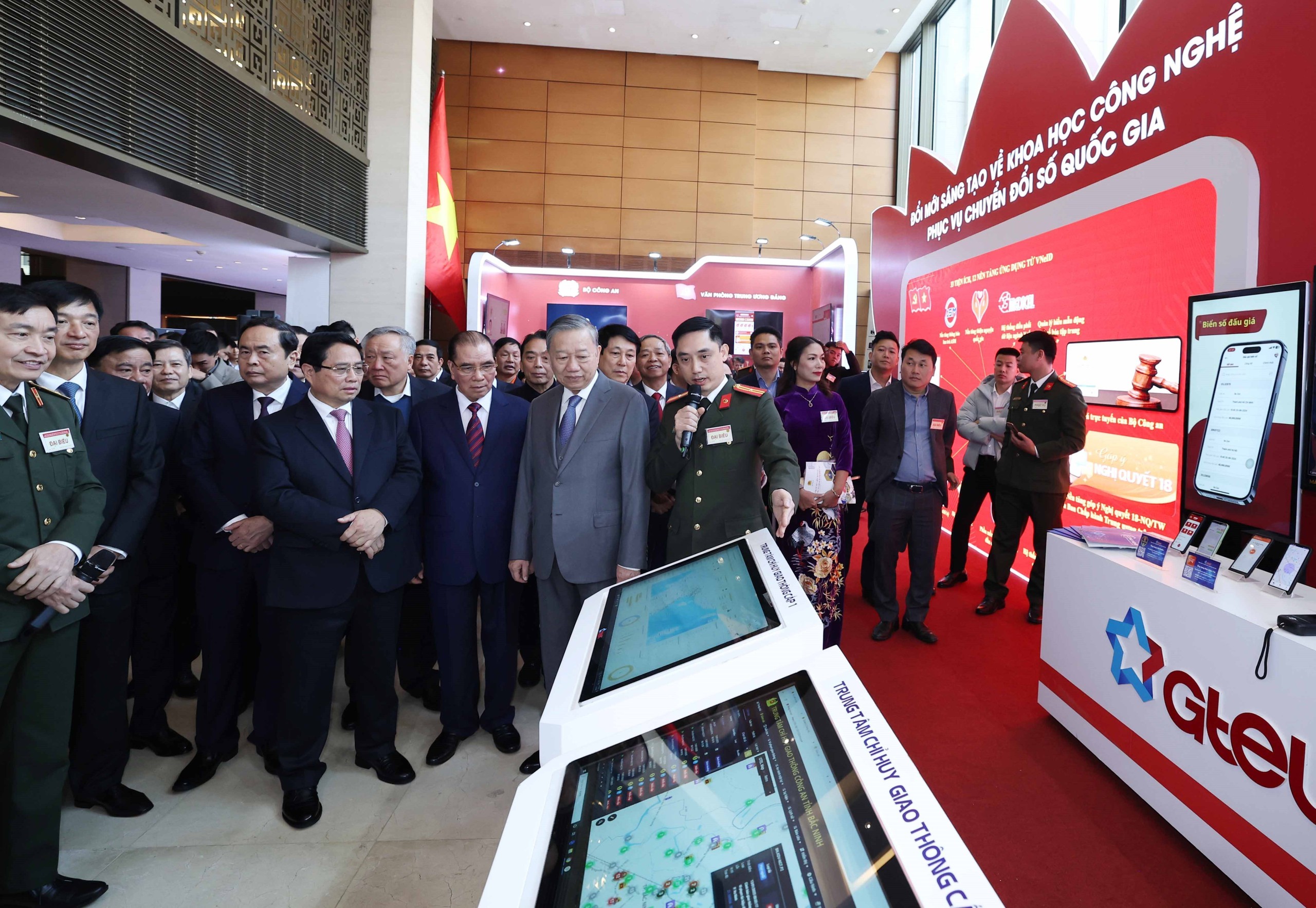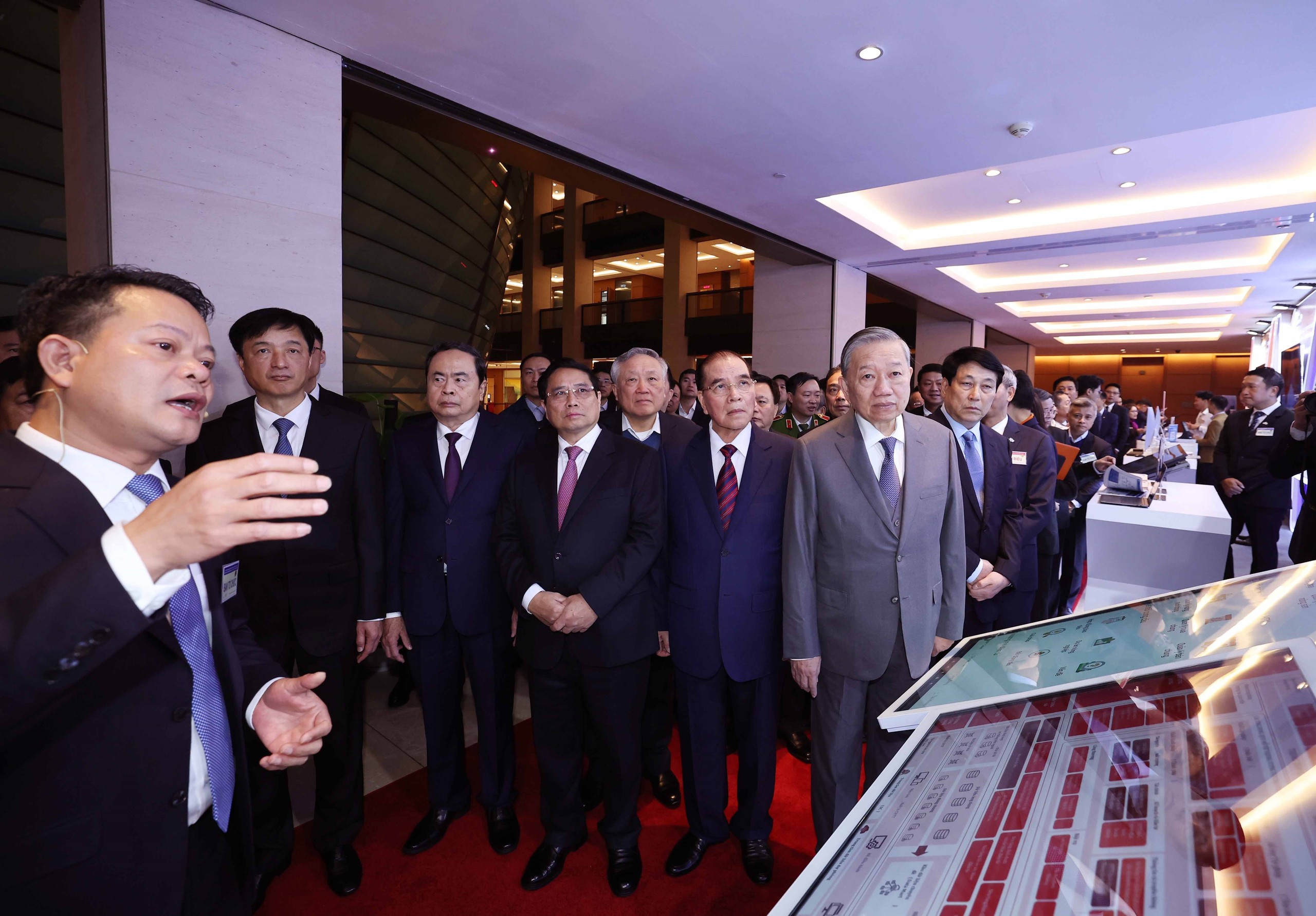 Tổng Bí thư Tô Lâm cùng các đồng chí lãnh đạo, nguyên lãnh đạo Đảng, Nhà nước thăm khu trưng bày khoa học, công nghệ, đổi mới sáng tạo và chuyển đổi số quốc gia, ngày 13/1/2025
