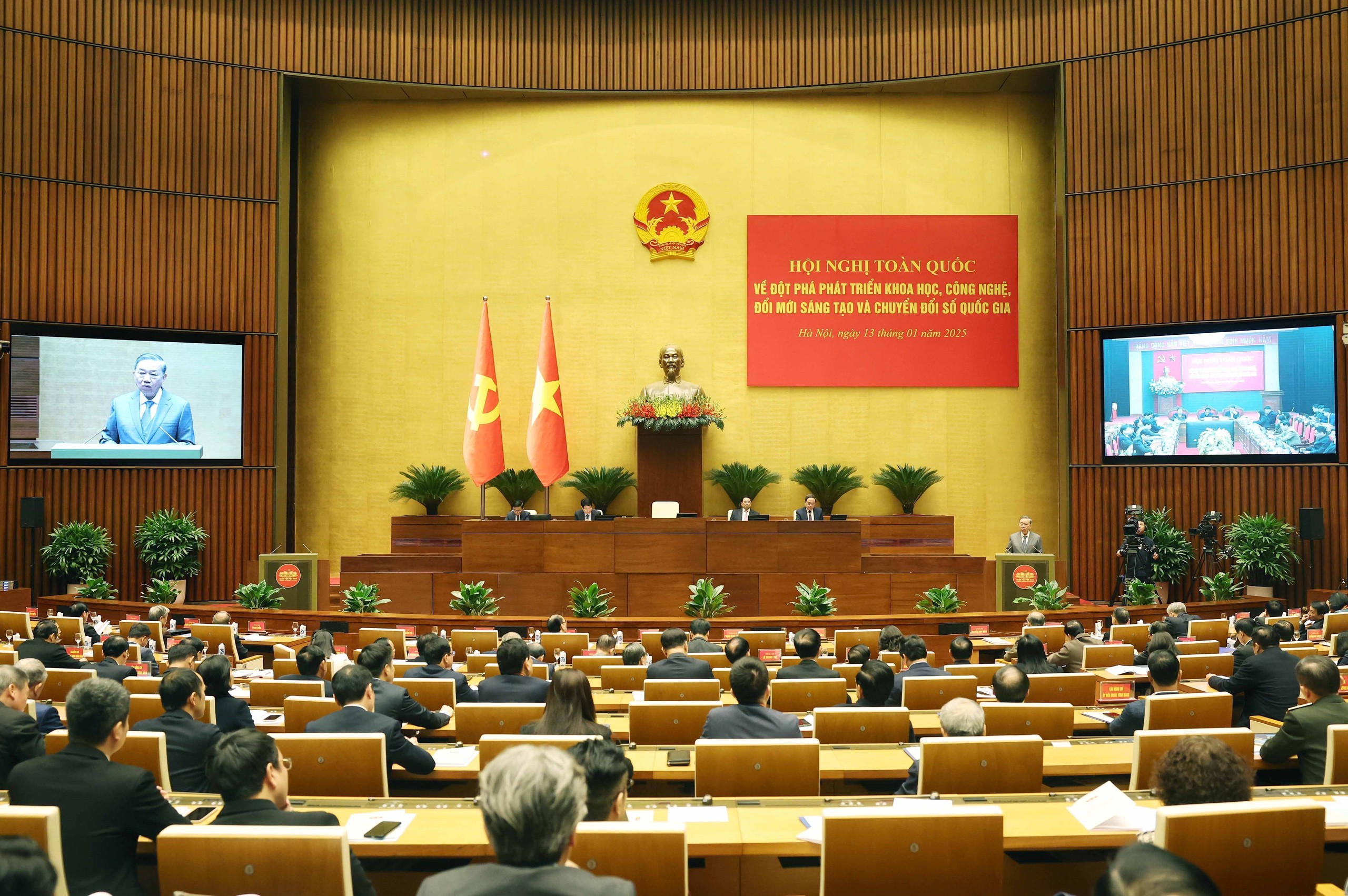 Tổng Bí thư Tô Lâm, Trưởng Ban Chỉ đạo Trung ương về phát triển khoa học, công nghệ, đổi mới sáng tạo và chuyển đổi số phát biểu chỉ đạo tại Hội nghị toàn quốc về đột phá phát triển khoa học, công nghệ, đổi mới sáng tạo và chuyển đổi số quốc gia, ngày 13/1/2025
