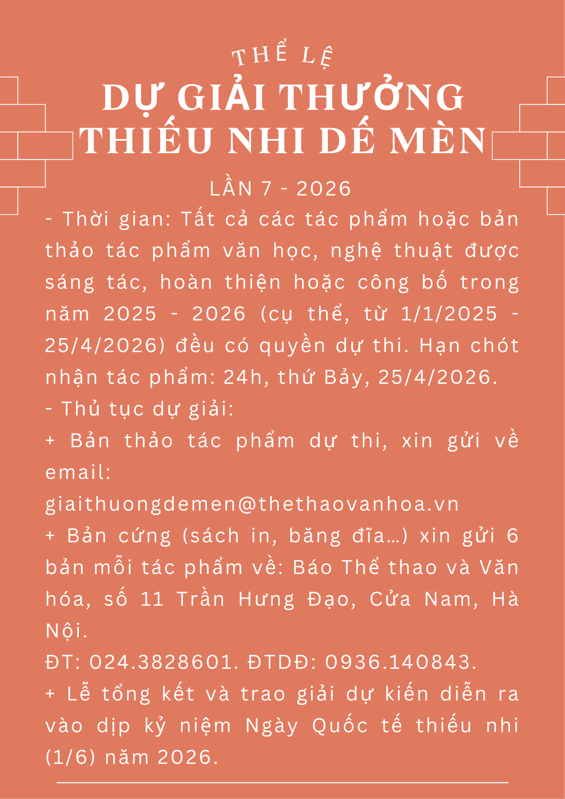 Ngày 26/3/2026, Ban tổ chức Giải thưởng Thiếu nhi Dế Mèn thuộc Báo Thể thao và Văn hóa (Thông tấn xã Việt Nam) chính thức phát động mùa giải thứ 7 năm 2026.