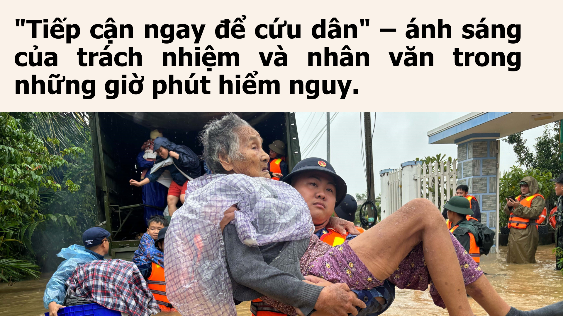 Những bàn tay khỏe khoắn của người lính, của công an, của dân quân gõ vào từng cánh cửa, dìu từng cụ già, bế từng đứa trẻ, trao từng phần lương khô – những khoảnh khắc ấy khắc họa đẹp nhất giá trị văn hóa Việt Nam trong gian nguy.