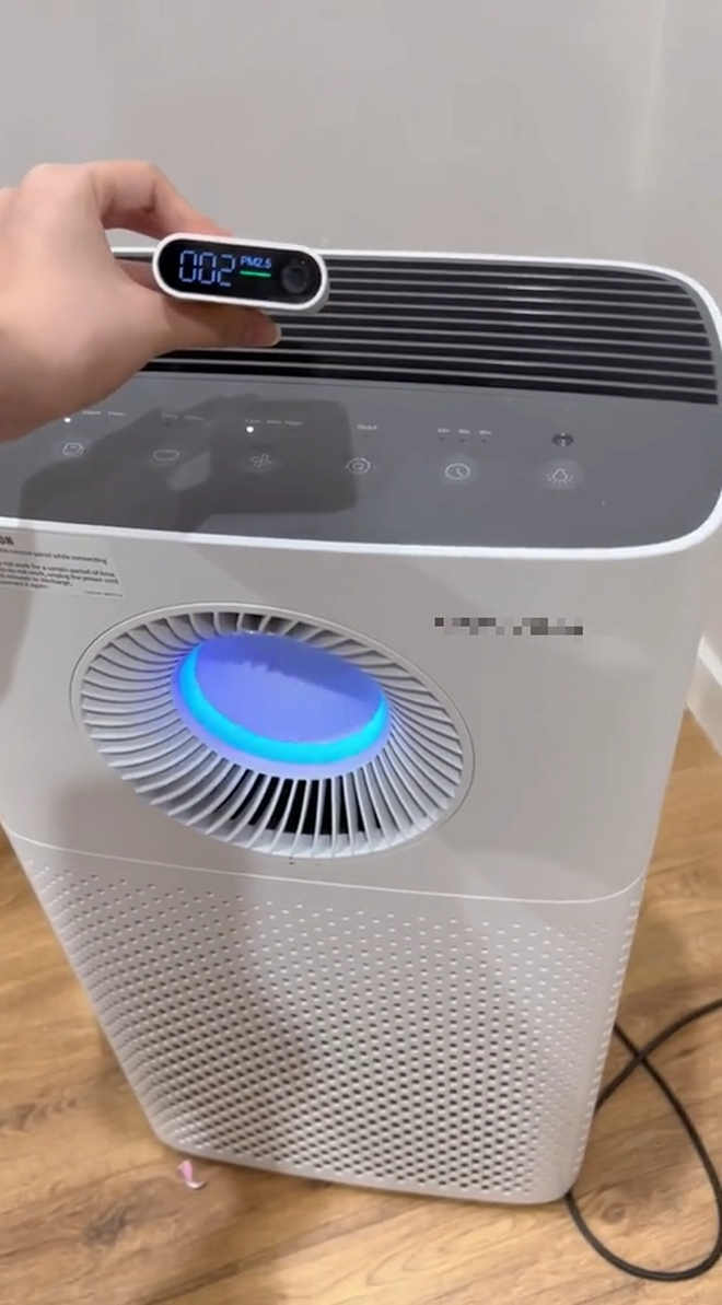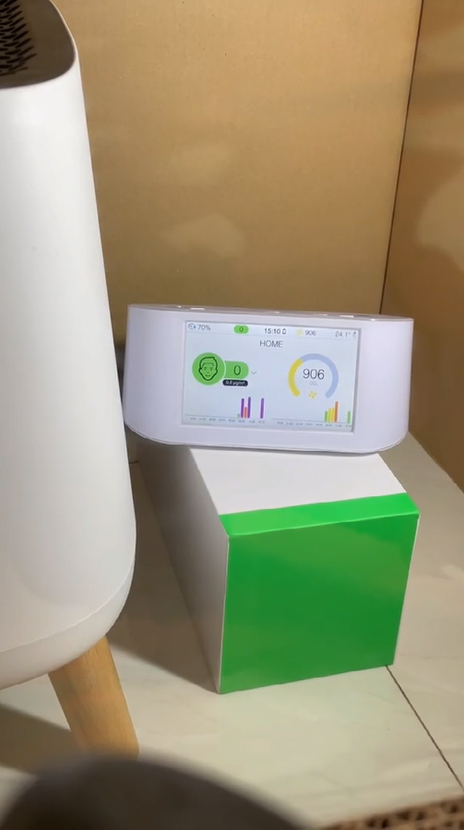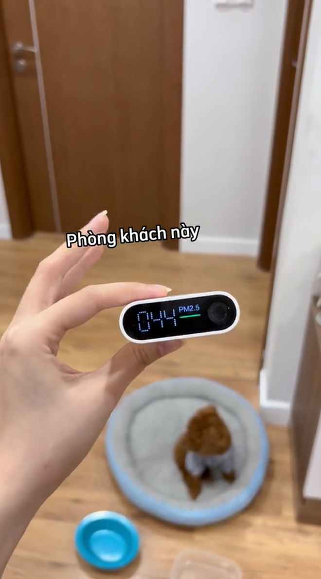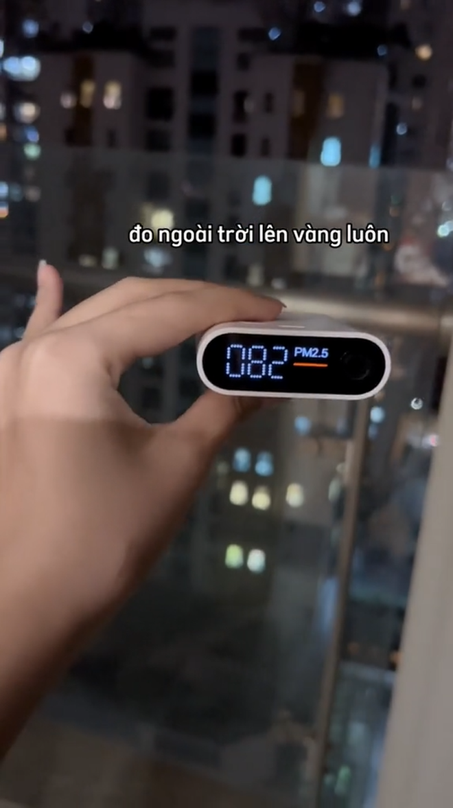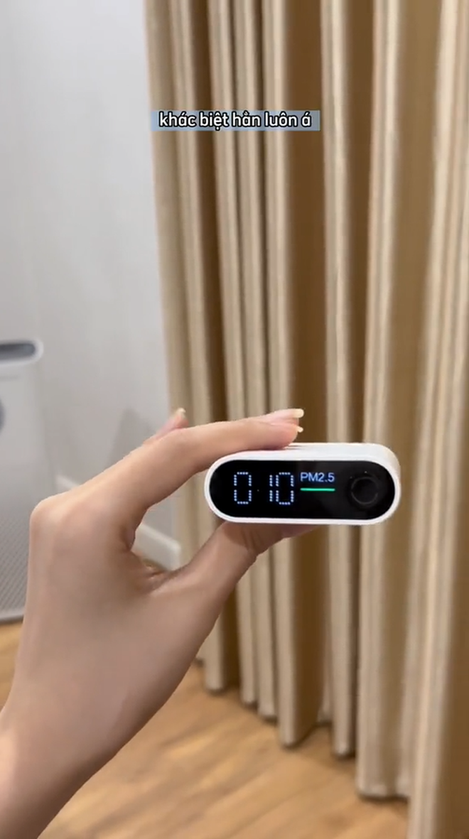 Theo kết quả trên máy đo, mức ô nhiễm trong không khí đạt màu cam và chỉ số 82. Tiếp đến, cô di chuyển tới khu vực phòng khách trong nhà, thì con số giảm xuống còn 44. Cuối cùng là tới khu vực phòng ngủ, nơi có đặt máy lọc không khí. Chỉ số ô nhiễm giảm xuống chỉ còn dưới 10, và khi đặt sát xuống khe thoát không khí của máy, con số chỉ còn là 2 cùng màu xanh lá, thể hiện cho việc không khí đã rất sạch.