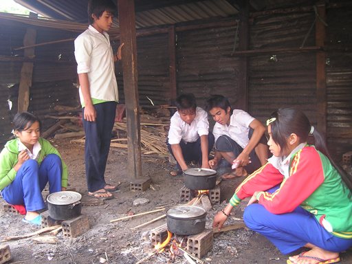 Trong ngôi nhà gỗ xiêu vẹo, bốn anh em: Tráng A Hường, học lớp 3, Tráng A Quang lớp 2, Tráng A Dình và Tráng Thị Bồng cùng lớp 1 phải tự chăm lo cho nhau. Mấy năm qua, bữa cơm các em chỉ có mì tôm, chút rau tự kiếm và thỉnh thoảng có cá khô. Chiếc nồi Tráng A Hường rang cá khô không có lấy một chút dầu mỡ, nước nấu cơm đục ngầu.