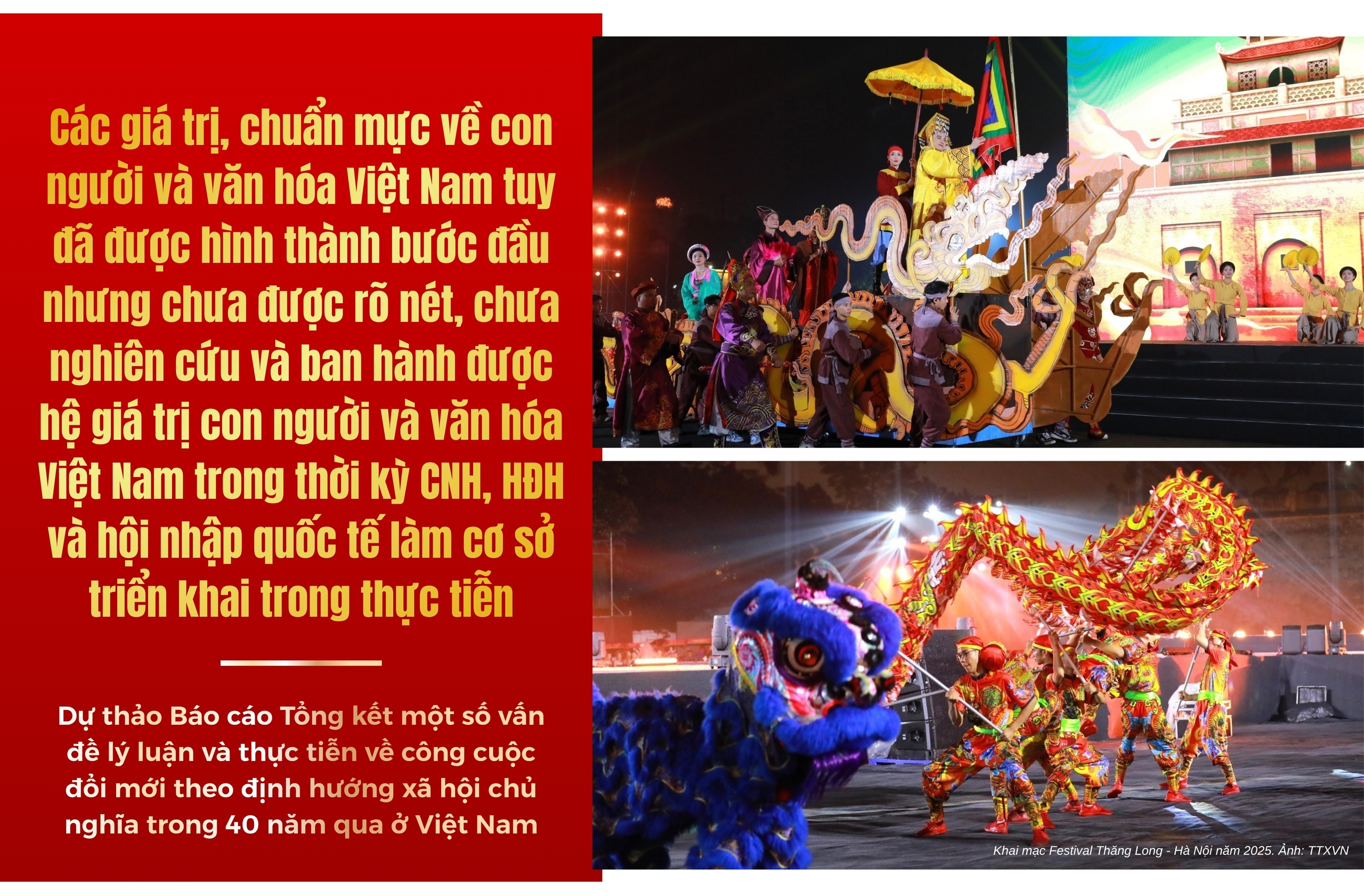 Cũng về nội dung này, trong "Dự thảo Báo cáo Tổng kết một số vấn đề lý luận và thực tiễn về công cuộc đổi mới theo định hướng xã hội chủ nghĩa trong 40 năm qua ở Việt Nam", Đảng cũng nêu rõ mặt hạn chế, cụ thể là: "Các giá trị, chuẩn mực về con người và văn hóa Việt Nam tuy đã được hình thành bước đầu nhưng chưa được rõ nét, chưa nghiên cứu và ban hành được hệ giá trị con người và văn hóa Việt Nam trong thời kỳ CNH, HĐH và hội nhập quốc tế làm cơ sở triển khai trong thực tiễn".