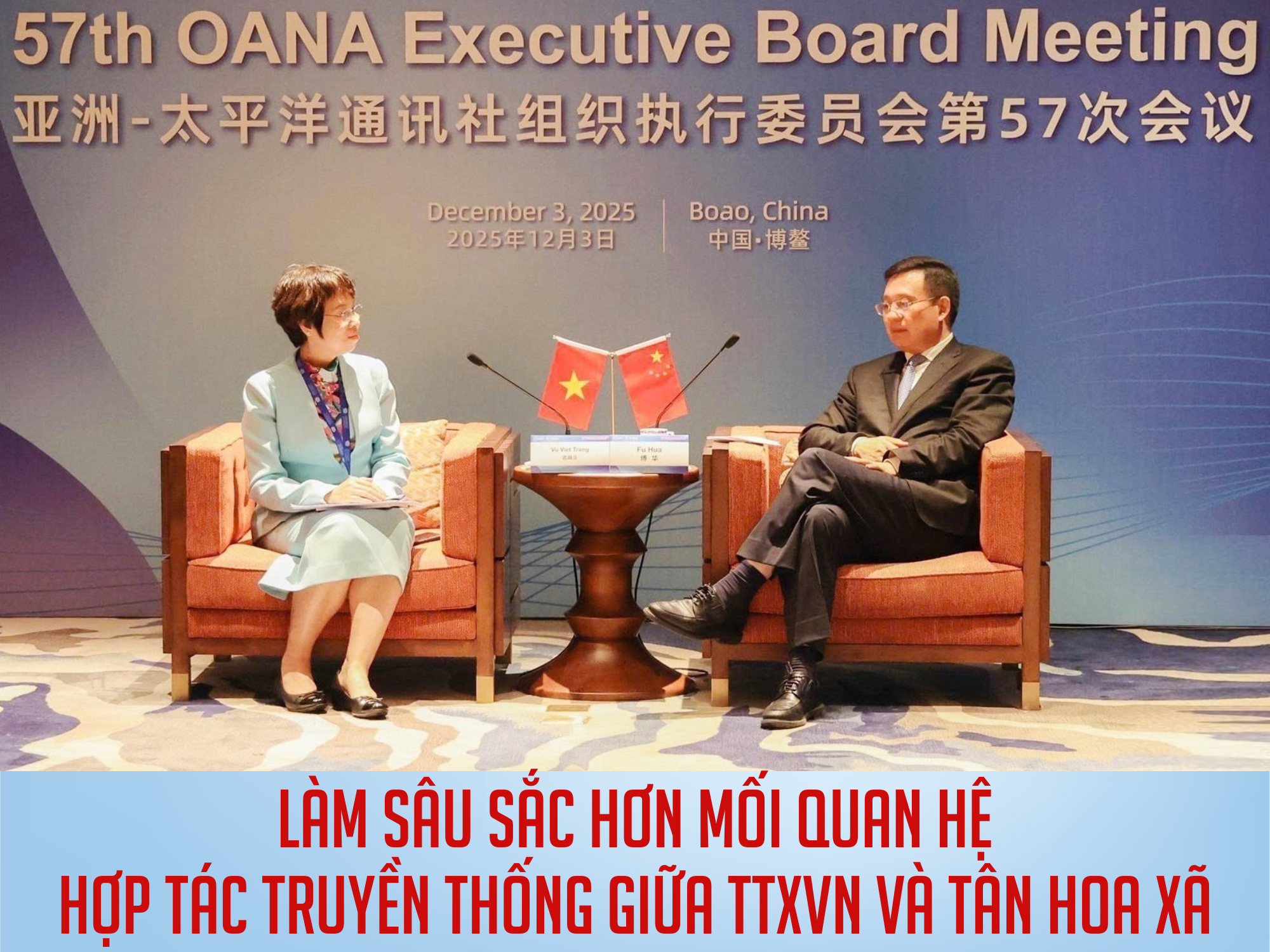 Đây là nhận thức chung được Tổng giám đốc TTXVN Vũ Việt Trang và Ủy viên Ban chấp hành Trung ương Đảng Cộng sản Trung Quốc, Xã trưởng Tân Hoa xã Phó Hoa chia sẻ tại cuộc hội đàm tại Trung Quốc ngày 3/12 nhân dịp đồng chí Vũ Việt Trang tham dự Hội nghị Ban chấp hành Tổ chức các hãng thông tấn châu Á-Thái Bình Dương (OANA) lần thứ 57 được tổ chức tại tỉnh Hải Nam từ ngày 2-4/12.