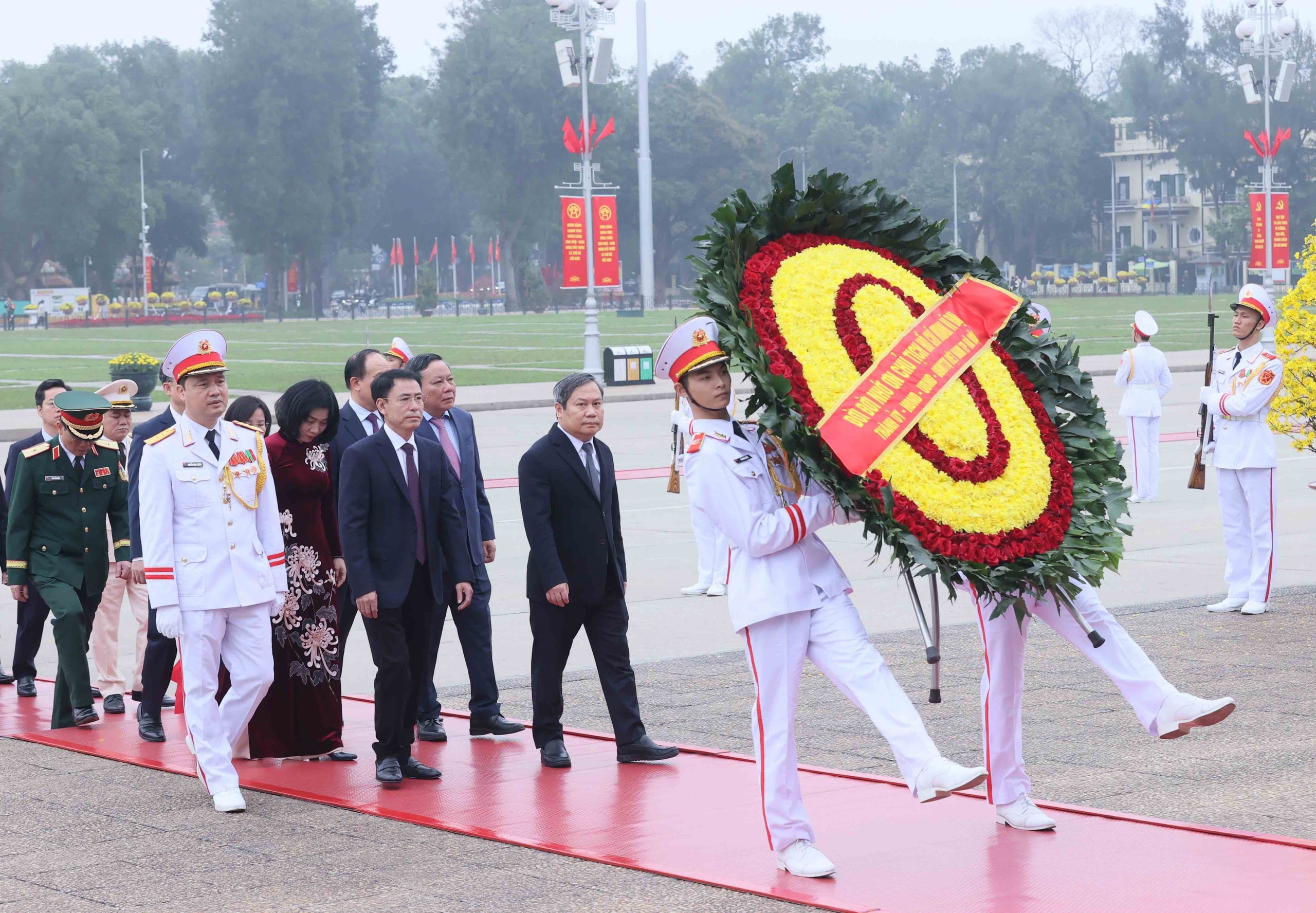 Đoàn đại biểu Ban Chấp hành Trung ương Đảng, Chủ tịch nước, Quốc hội, Chính phủ, Ủy ban Trung ương Mặt trận Tổ quốc Việt Nam đến đặt vòng hoa, vào Lăng viếng Chủ tịch Hồ Chí Minh. Ảnh: An Đăng - TTXVN