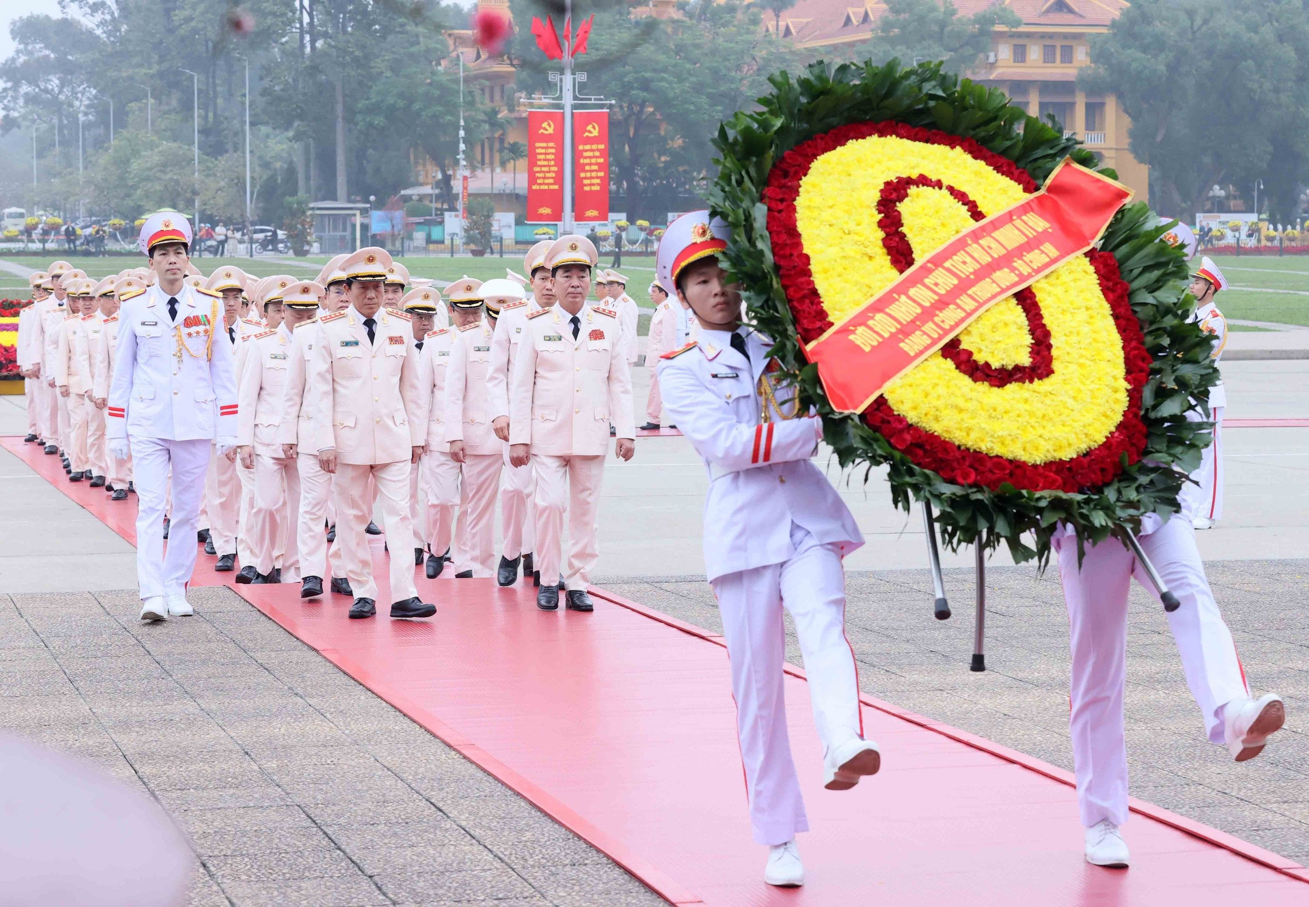 Đoàn đại biểu Đảng ủy Công an Trung ương, Bộ Công an đến đặt vòng hoa và vào Lăng viếng Chủ tịch Hồ Chí Minh. Ảnh: An Đăng - TTXVN