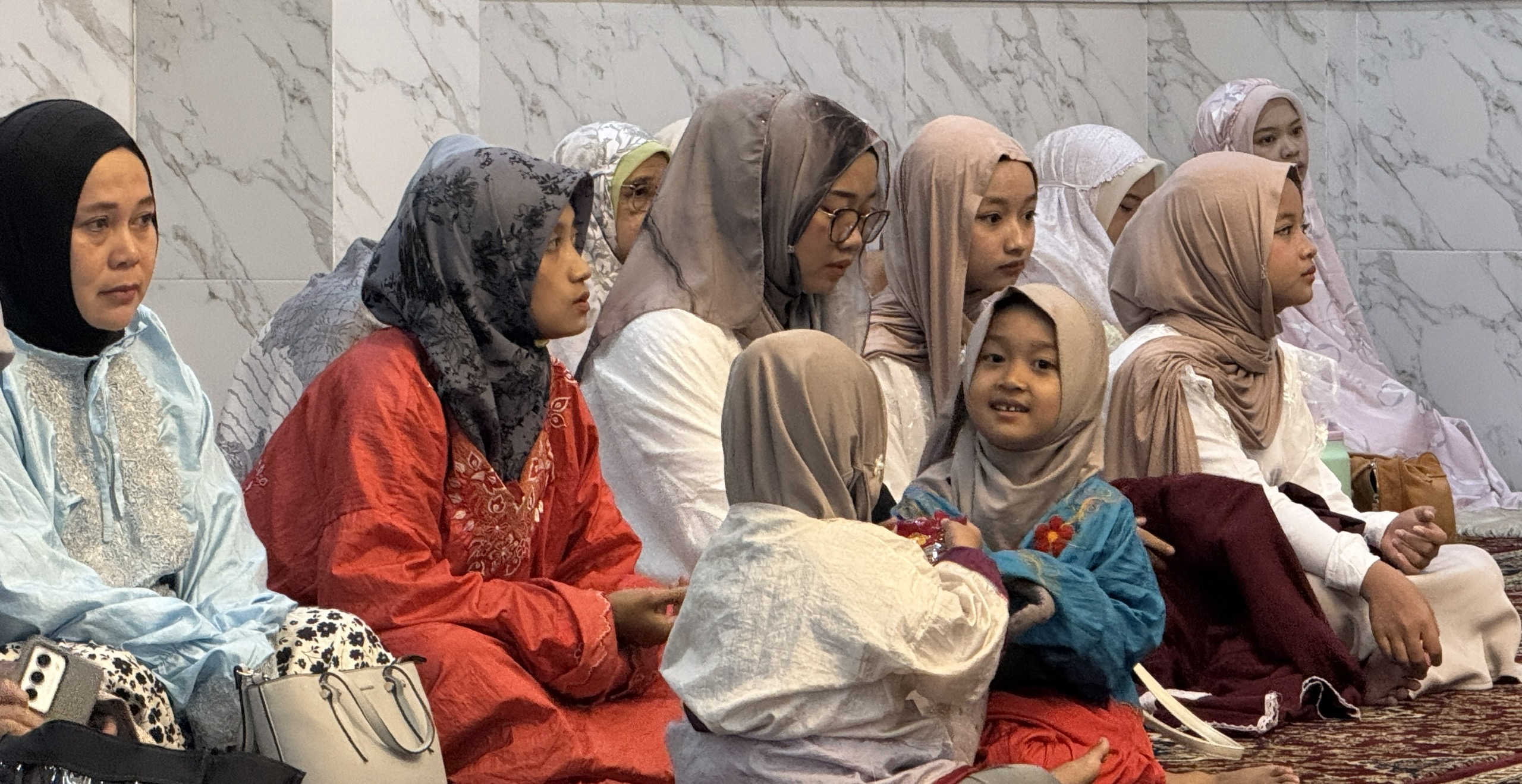 Các bé gái cũng được mặc bộ áo váy kèm khăn trùm đầu (mukena) để hành lễ. Ảnh: Đỗ Quyên – PV TTXVN tại Indonesia