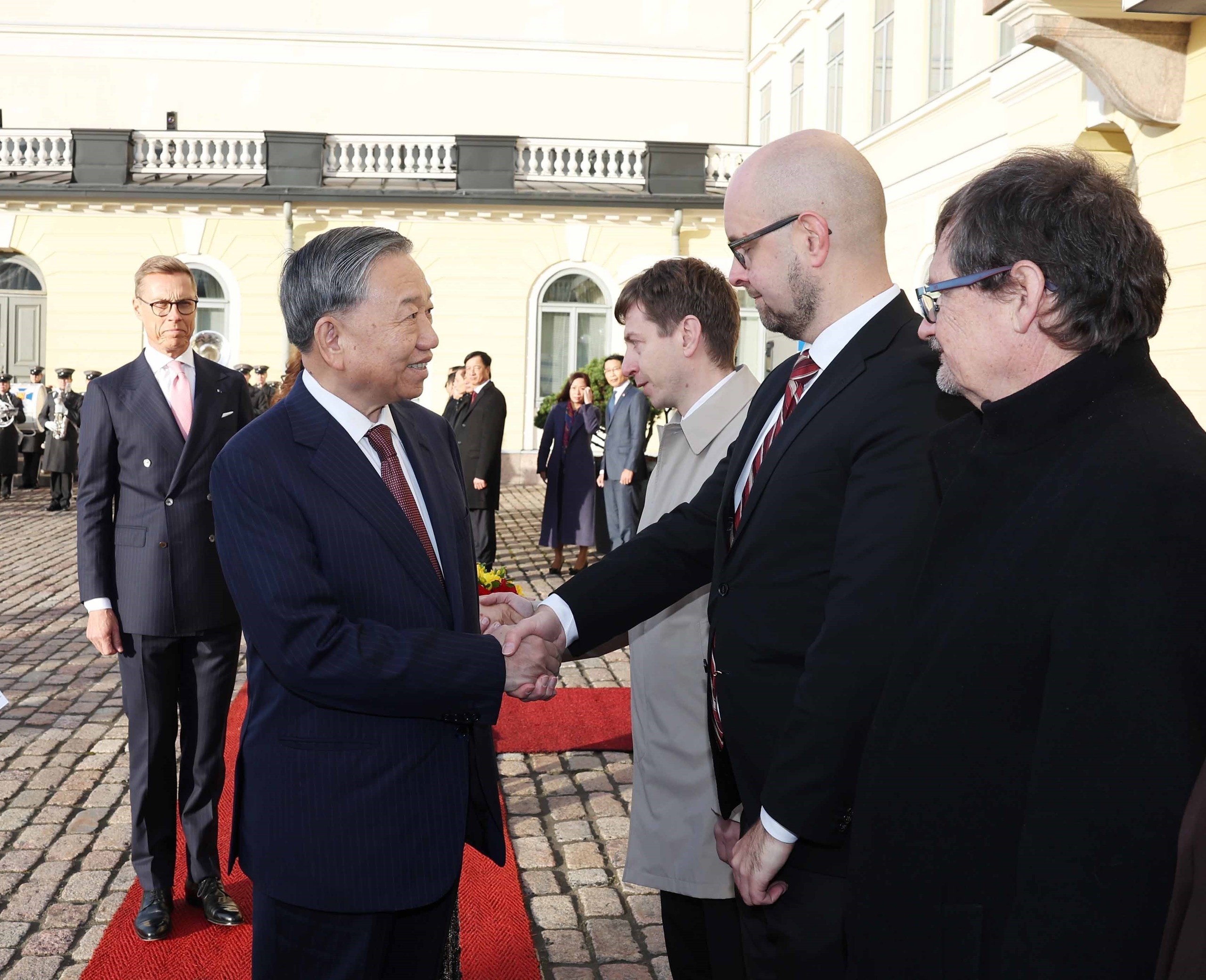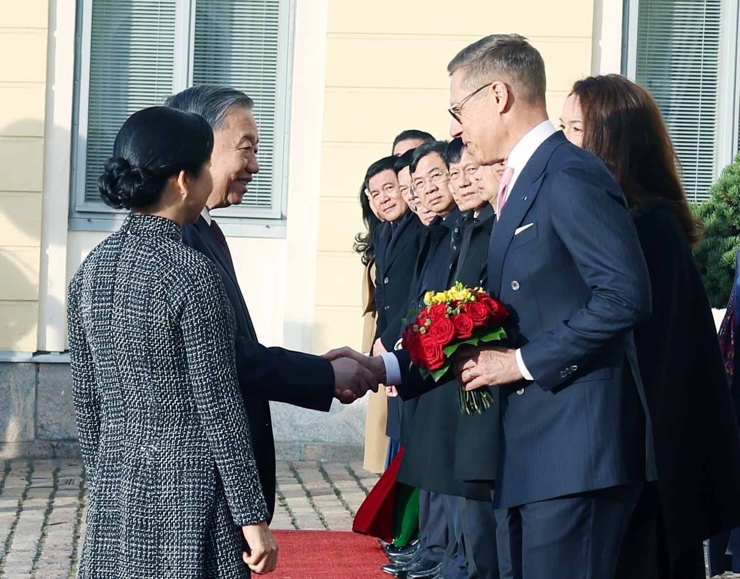 Đúng 10h00 (theo giờ địa phương), xe chở Tổng Bí thư Tô Lâm và Phu nhân tiến vào Phủ Tổng thống. Tổng thống Cộng hòa Phần Lan Alexander Stubb và Phu nhân chào đón Tổng Bí thư Tô Lâm và Phu nhân tại nơi đỗ xe, sau đó mời Tổng Bí thư Tô Lâm và Phu nhân đứng vào vị trí danh dự. Quân nhạc cử Quốc thiều Việt Nam và Quốc thiều Phần Lan. Hai bên đã giới thiệu đại biểu tham dự tại Lễ đón.