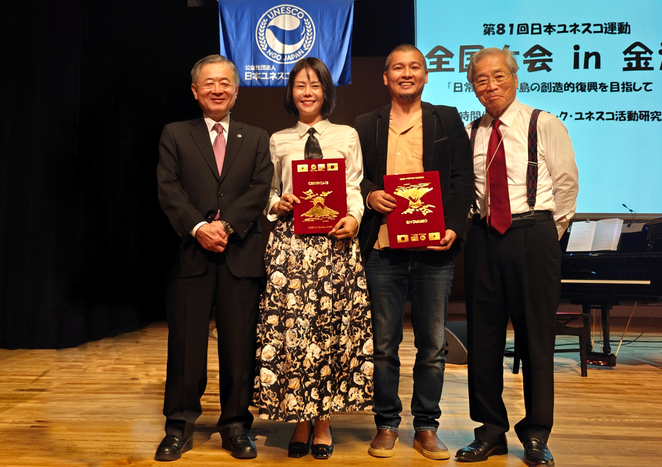 Nghệ sĩ Lê Hữu Hiếu và đoàn đại biểu khách mời Việt Nam dự Lễ kỷ niệm 81 năm Ngày thành lập Liên hiệp các Hội UNESCO Nhật Bản tại Kanazawa – Nhật Bản. Ảnh: BTC