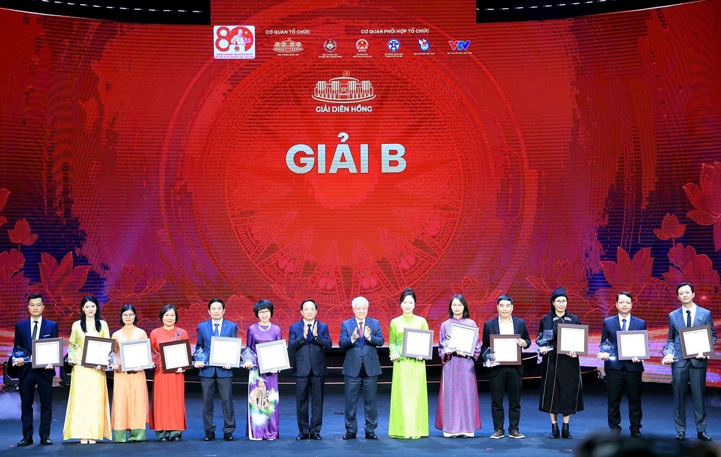 Các tác giả và nhóm tác giả đạt giải B. Ảnh: Tuấn Anh - TTXVN