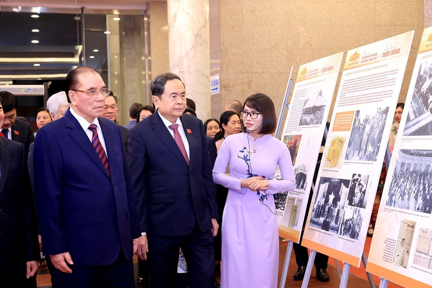 Chủ tịch Quốc hội Trần Thanh Mẫn cùng các đại biểu tham quan Trưng bày ảnh "Khoảnh khắc Diên Hồng". Ảnh: Tuấn Anh - TTXVN