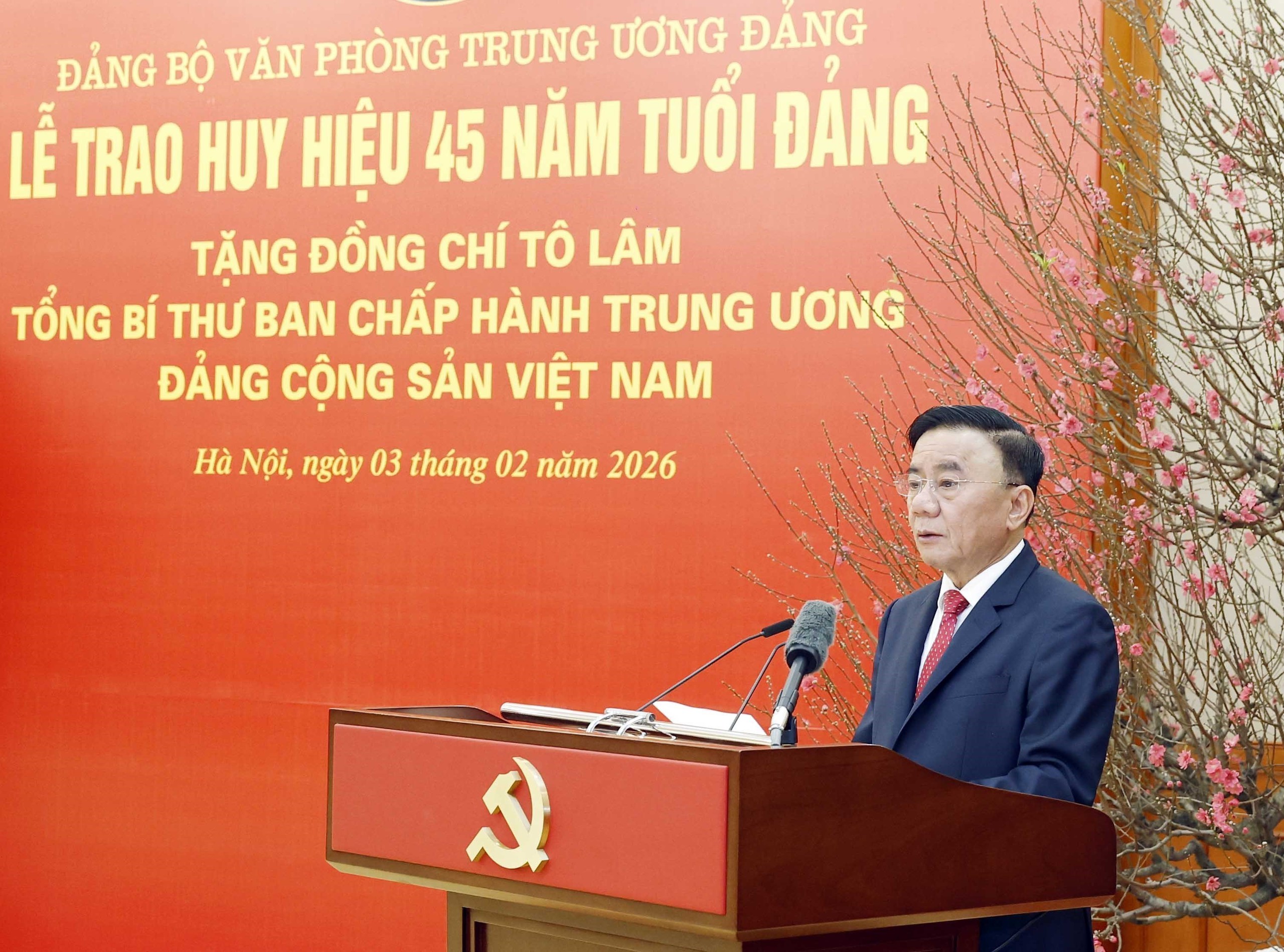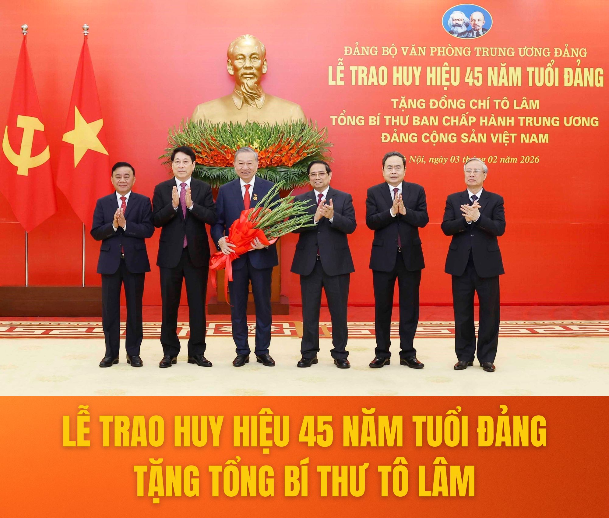 Kỷ niệm 96 năm Ngày thành lập Đảng Cộng sản Việt Nam (3/2/1930 - 3/2/2026), sáng 3/2, tại Trụ sở Trung ương Đảng, Đảng ủy Văn phòng Trung ương Đảng đã tổ chức Lễ trao Huy hiệu 45 năm tuổi Đảng tặng đồng chí Tô Lâm, Tổng Bí thư Ban Chấp hành Trung ương Đảng Cộng sản Việt Nam.