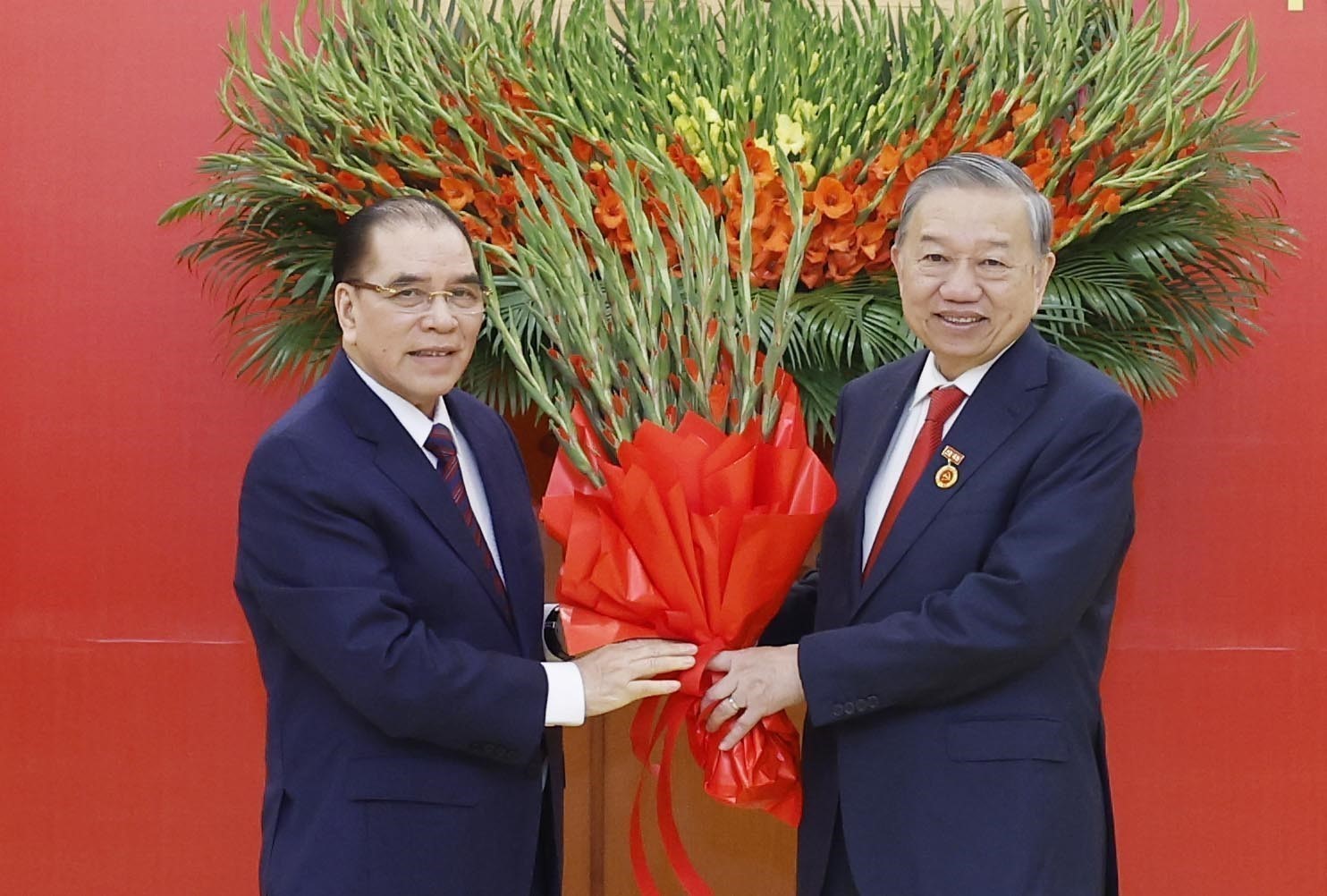 Nguyên Tổng Bí thư Nông Đức Mạnh tặng hoa chúc mừng Tổng Bí thư Tô Lâm. Ảnh: Thống Nhất – TTXVN