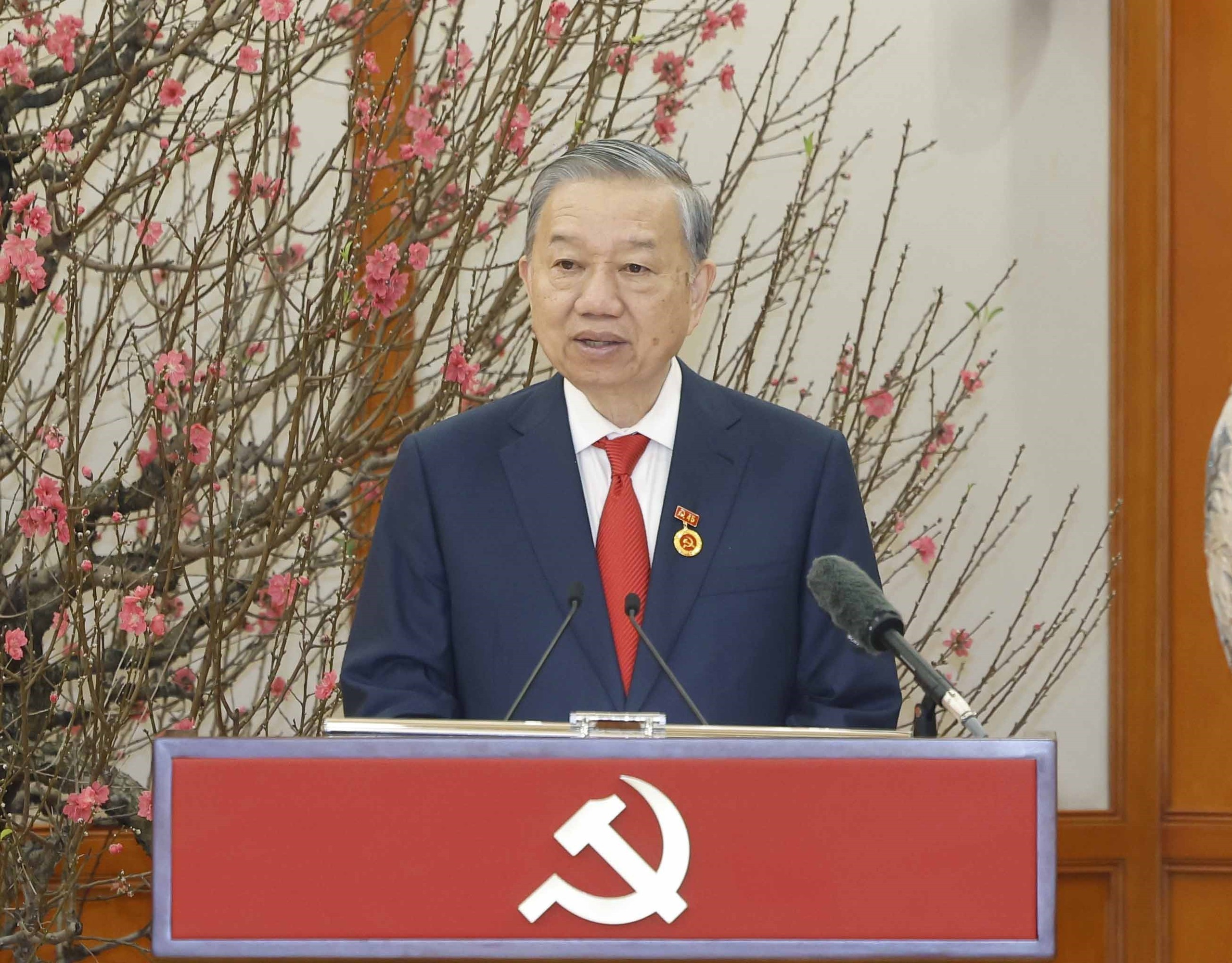 Thay mặt lãnh đạo Đảng, đồng chí Trần Cẩm Tú, Thường trực Ban Bí thư đã trân trọng trao Huy hiệu 45 tuổi Đảng và tặng hoa chúc mừng đồng chí Tô Lâm, Tổng Bí thư Ban Chấp hành Trung ương Đảng Cộng sản Việt Nam.