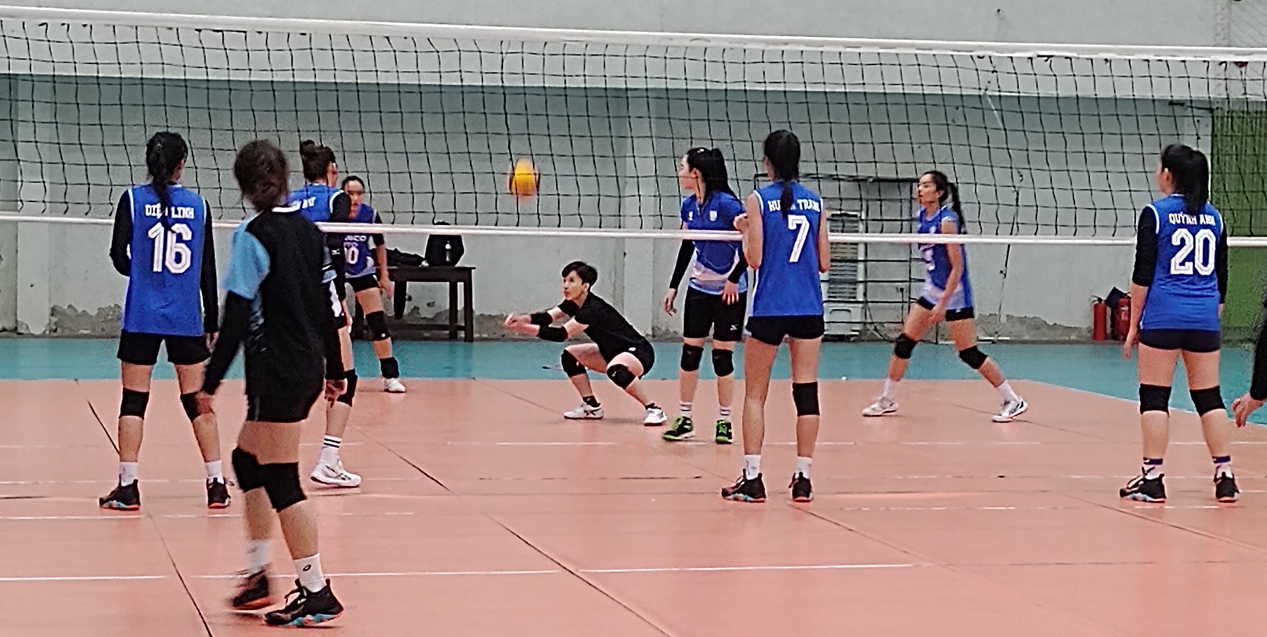 Khánh Đang (áo đen, ở bên này sân) trong một buổi tập giáp tết Bính Ngọ ở CLB bóng chuyền nữ Hà Nội
