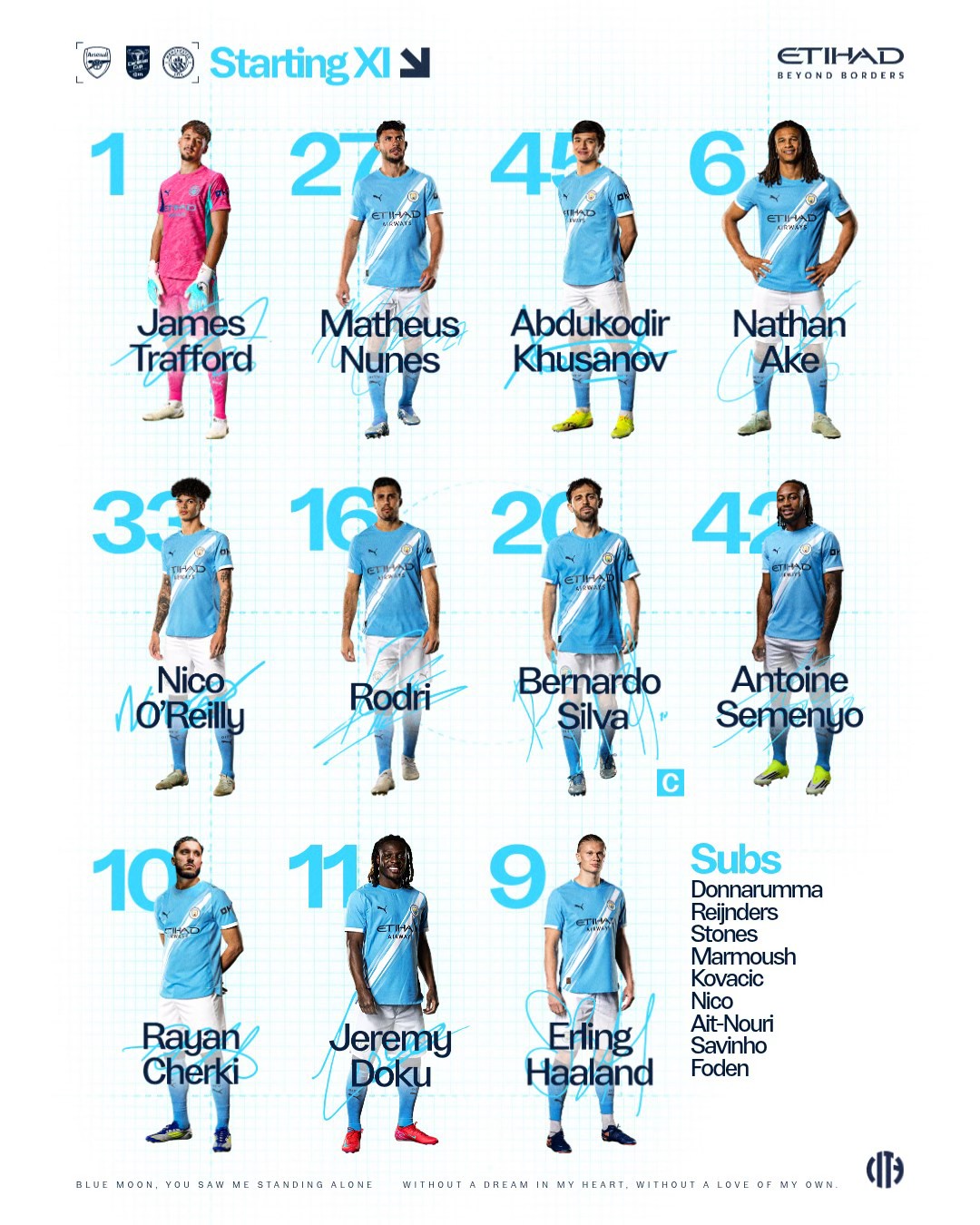Man City: James Trafford - Nunes Matheus Luiz, Abduqodir Khusanov, Nathan Ake, Nico O'Reilly - Rodrigo Hernandez Rodri - Rayan Cherki, Bernardo Silva, Jeremy Doku, Antoine Semenyo - Haaland