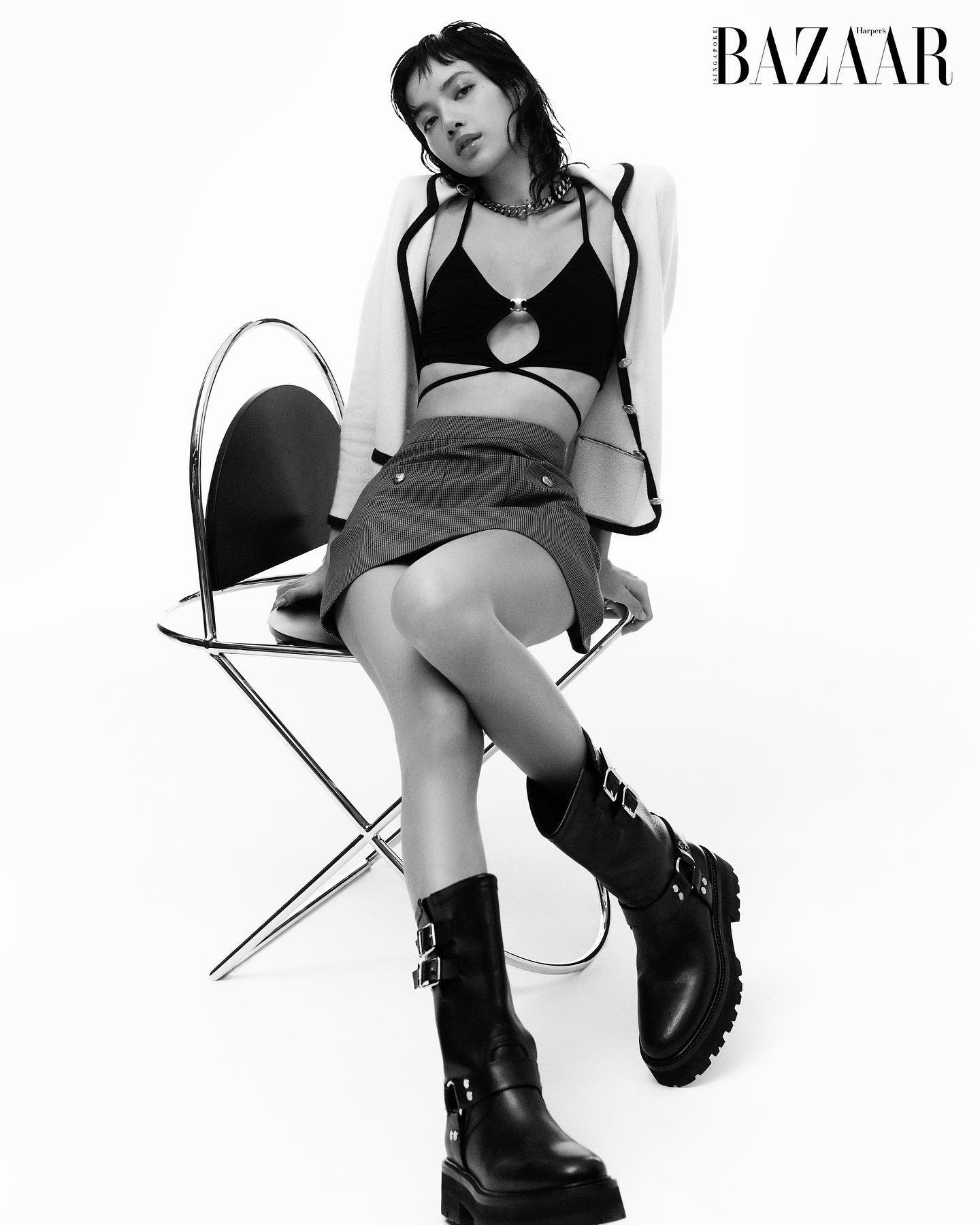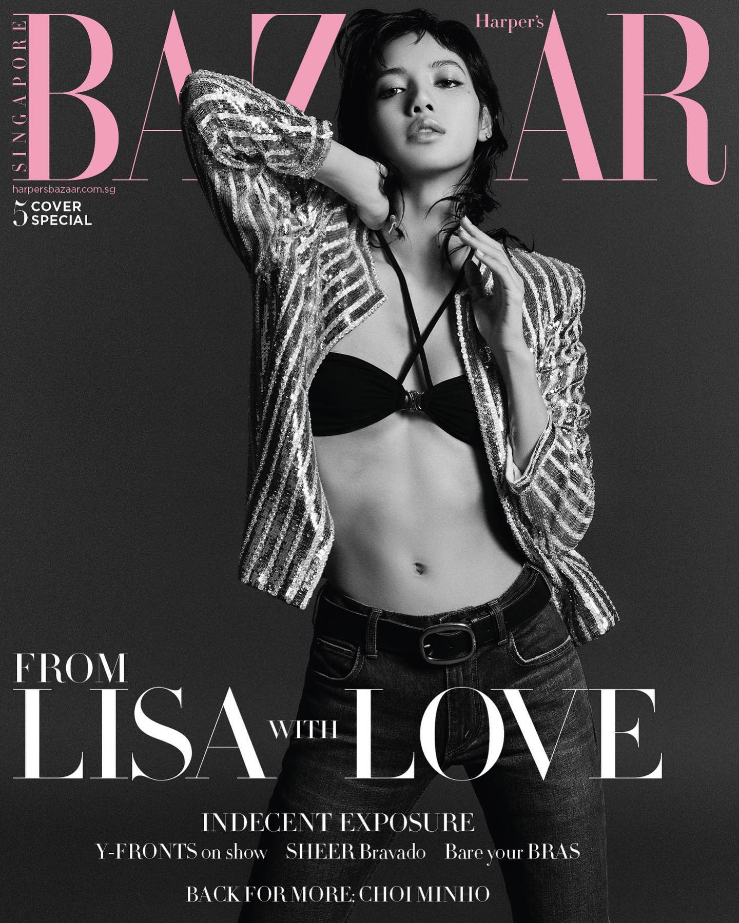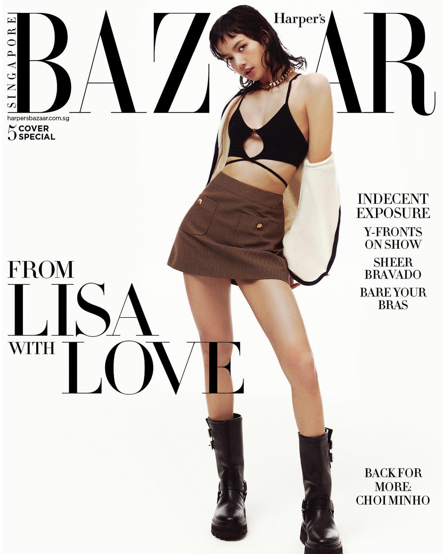 Lisa mang lên bìa Harper's Bazaar Singapore một diện mạo hoàn toàn mới bên mái tóc mullet độc đáo. Cô nàng không ngại mặc hở, khoe trọn vòng eo thon, cơ bụng săn chắc cùng cặp chân dài bên phong cách thời thượng, cool ngầu. Bức ảnh diện áo hở vai, Lisa còn khoe lấp ló hình xăm nhỏ sau lưng