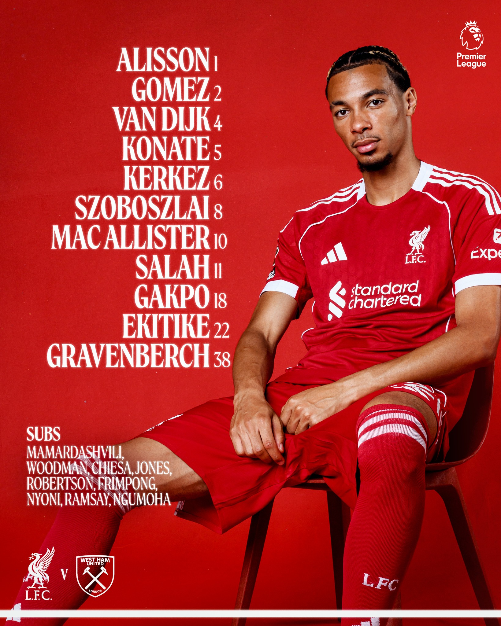 Liverpool: Alisson; Kerkez, Van Dijk, Konate, Szoboszlai; Mac Allister, Gravenberch; Gakpo, Wirtz, Salah; Ekitike.