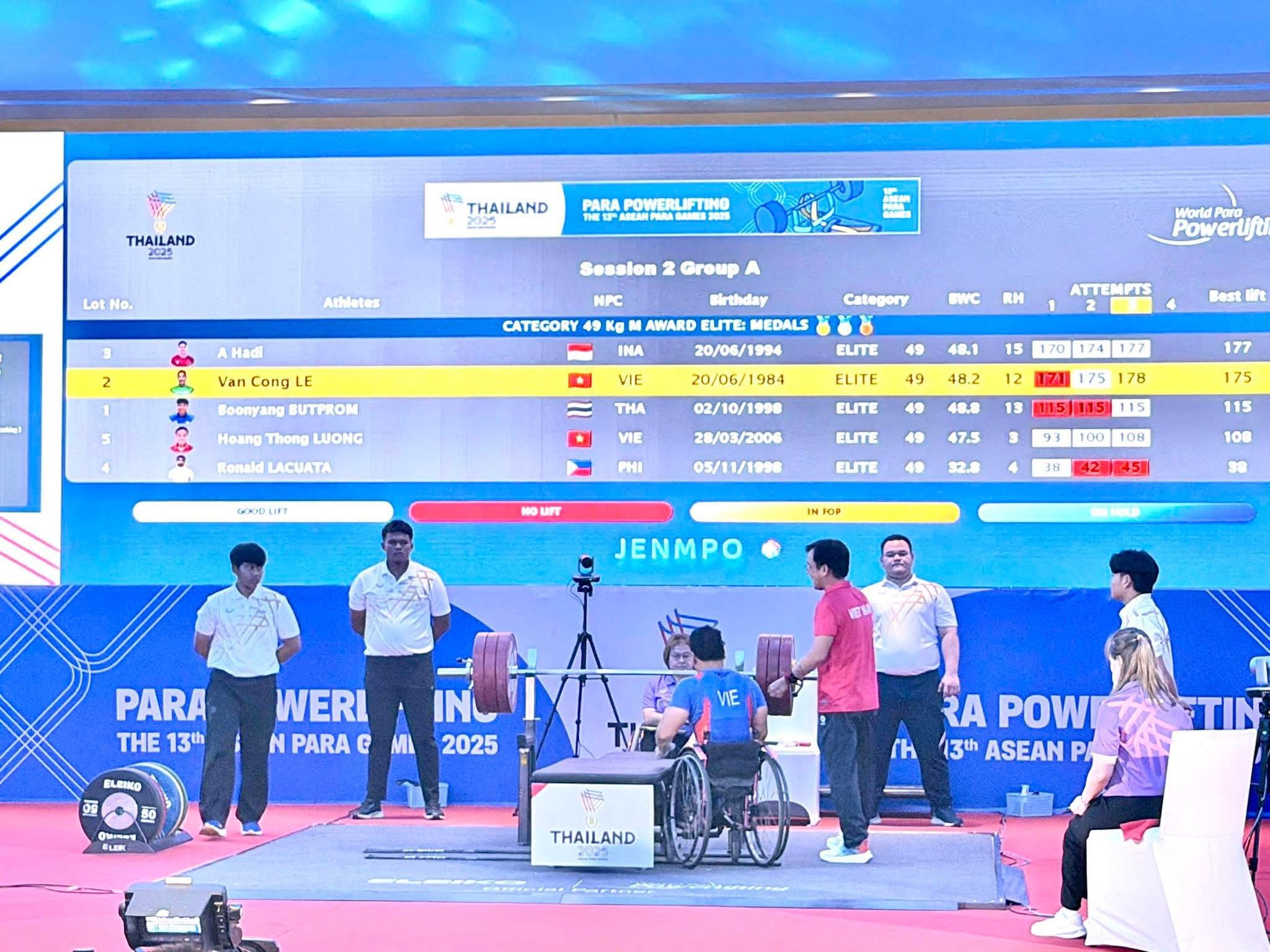 Cuộc cạnh tranh diễn ra đặc biệt căng thẳng khi đối thủ Abdul Hadi (Indonesia) liên tục bám đuổi sát sao. Lực sĩ Indonesia đạt thành tích 177kg và giành huy chương bạc, trong khi huy chương đồng thuộc về lực sĩ chủ nhà Butprom Boonyang (Thái Lan) với mức tạ 115kg. Đây cũng là kịch bản quen thuộc khi tại ASEAN Para Games 12, Lê Văn Công từng giành vàng còn Abdul Hadi xếp thứ hai ở cùng hạng cân.