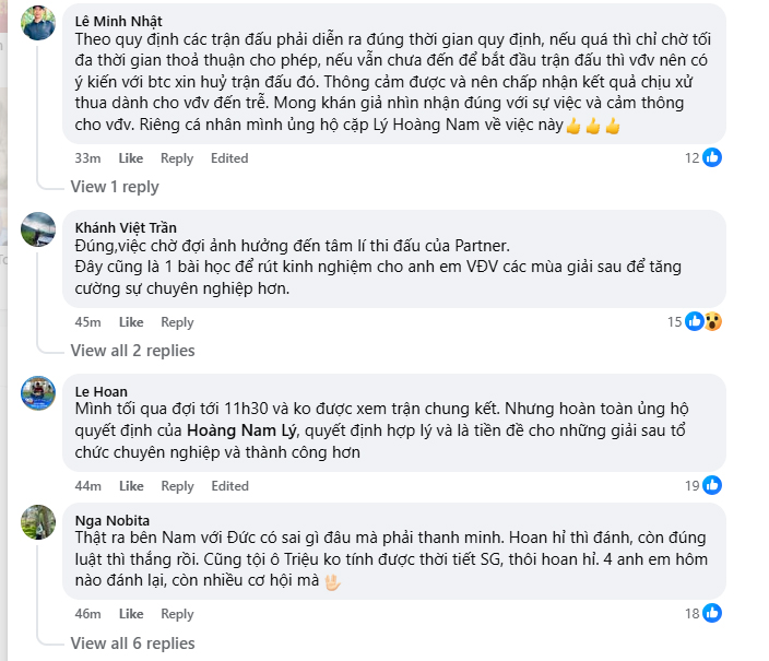 Nam và Đức gửi lời xin lỗi chân thành đến khán giả vì sự việc đã ảnh hưởng đến những người mong chờ trận chung kết. Cả hai đã chuẩn bị kỹ lưỡng cho trận đấu, đặc biệt Đức đã cố gắng quay lại sân sau một ngày dài để sẵn sàng thi đấu. Tuy nhiên, nhiều yếu tố khách quan, bao gồm thời tiết và lịch trình dày đặc, đã ảnh hưởng đến khả năng tổ chức trận đấu. Nam nhấn mạnh rằng anh không thể bỏ qua vấn đề sức khỏe và tâm lý của đồng đội trong tình huống này.