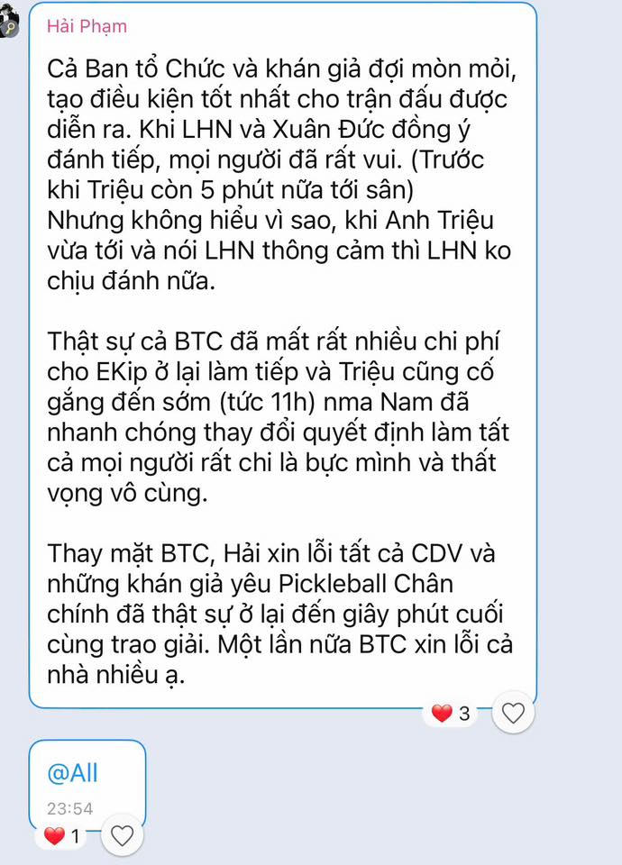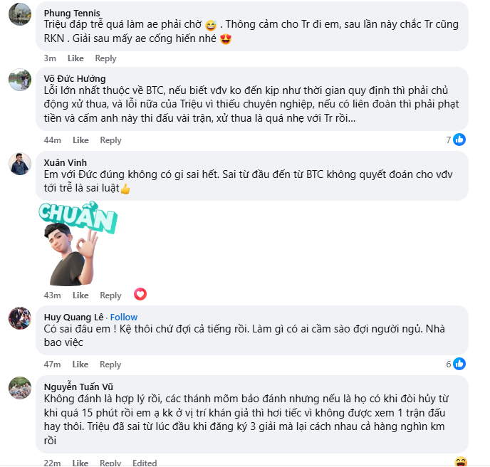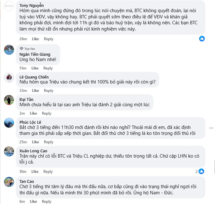 Sự việc này cũng làm dấy lên nhiều ý kiến trong cộng đồng pickleball Việt Nam. Một số người cho rằng việc Triệu “chạy sô” giữa hai giải đấu lớn trong cùng một ngày (từ trận đấu tại Hà Nội lúc 16:30 đến chuyến bay vào TP.HCM lúc 18:30) là thiếu tính chuyên nghiệp, trong khi những người khác bày tỏ sự tiếc nuối khi không được chứng kiến màn trình diễn được kỳ vọng.