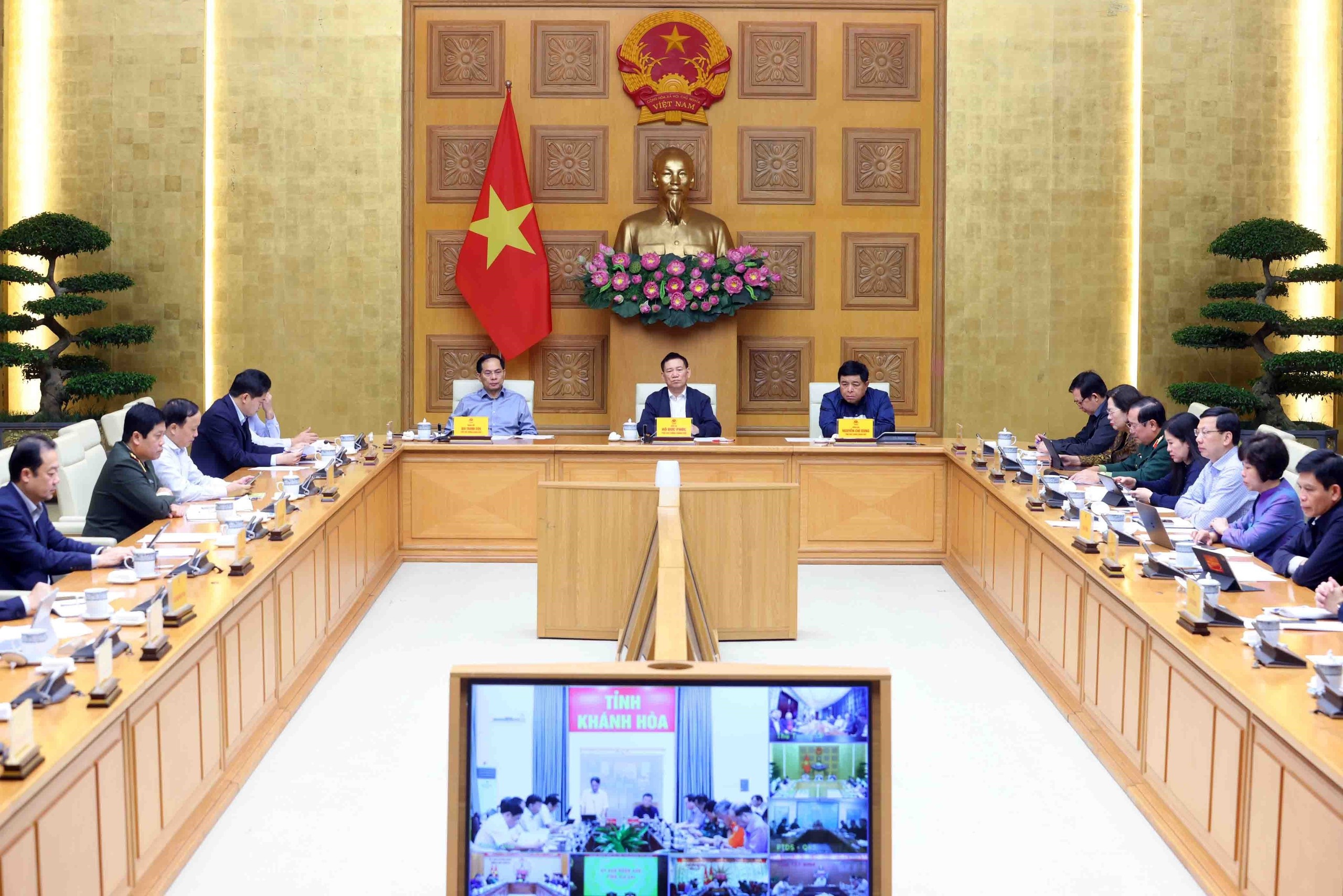 Các Phó Thủ tướng Hồ Đức Phớc, Bùi Thanh Sơn, Nguyễn Chí Dũng, Hồ Quốc Dũng cùng lãnh đạo các bộ, ngành, Ban Chỉ đạo Phòng thủ dân sự Quốc gia tham dự cuộc họp tại điểm cầu trụ sở Chính phủ ngày 23/11/2025