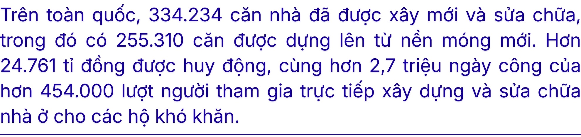 Trên toàn quốc, 334.234 căn nhà đã được xây mới và sửa chữa, trong đó có 255.310 căn được dựng lên từ nền móng mới. Hơn 24.761 tỉ đồng được huy động, cùng hơn 2,7 triệu ngày công của hơn 454.000 lượt người tham gia trực tiếp xây dựng và sửa chữa nhà ở cho các hộ khó khăn.