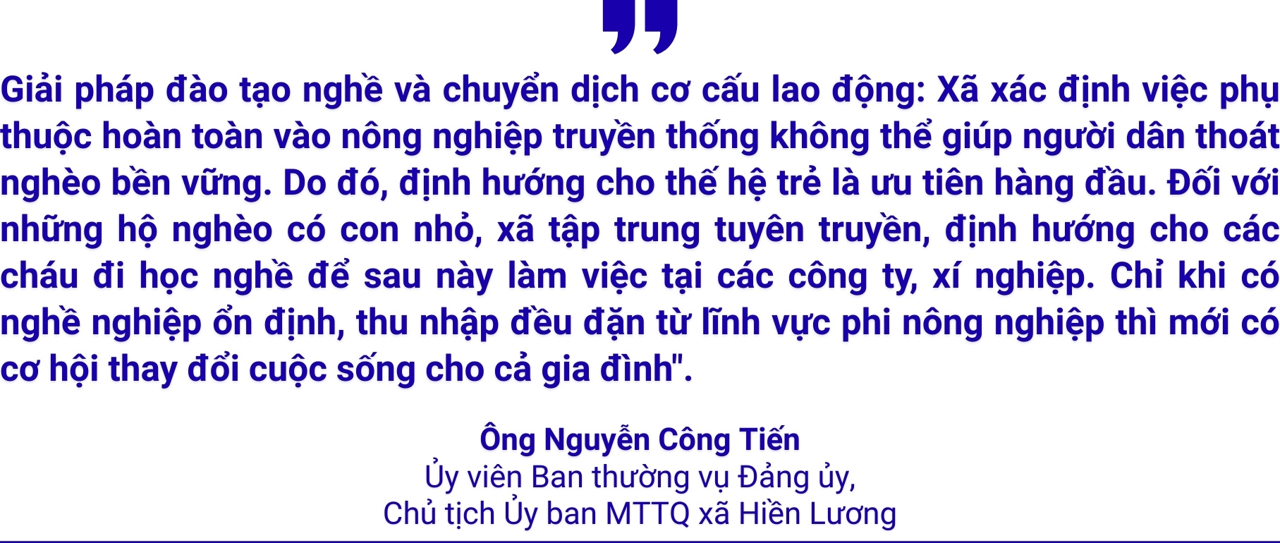 Trước thực trạng trên, chính quyền xã Hiền Lương đã xác định mục tiêu chiến lược: Phấn đấu đến năm 2030 trên địa bàn sẽ không còn hộ nghèo. Để đạt được kết quả này một cách bền vững, ông Nguyễn Công Tiến cho biết xã đang tập trung triển khai đồng bộ các nhóm giải pháp, chuyển từ hỗ trợ "cho không" sang hỗ trợ sinh kế và đào tạo.