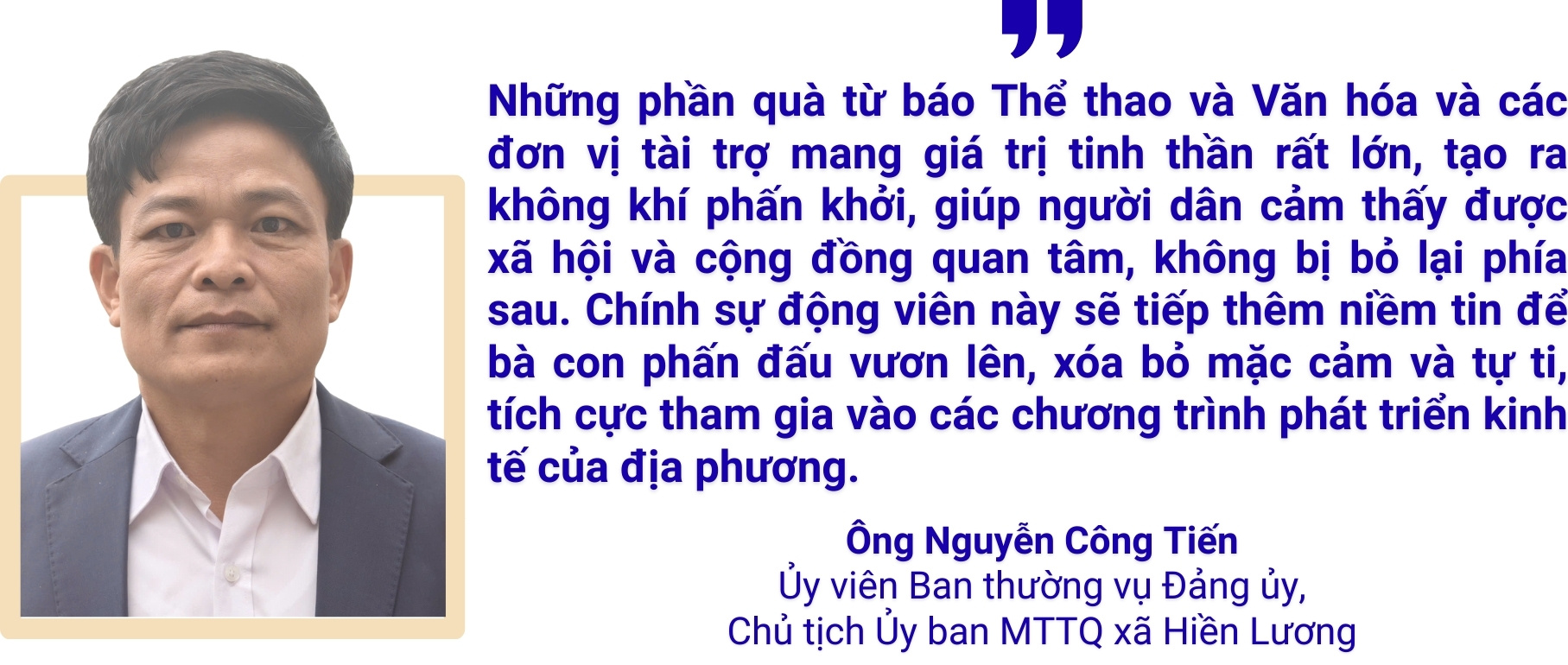 Ông Tiến khẳng định: "Những phần quà từ báo Thể thao và Văn hóa và các đơn vị tài trợ mang giá trị tinh thần rất lớn, tạo ra không khí phấn khởi, giúp người dân cảm thấy được xã hội và cộng đồng quan tâm, không bị bỏ lại phía sau. Chính sự động viên này sẽ tiếp thêm niềm tin để bà con phấn đấu vươn lên, xóa bỏ mặc cảm và tự ti, tích cực tham gia vào các chương trình phát triển kinh tế của địa phương".
