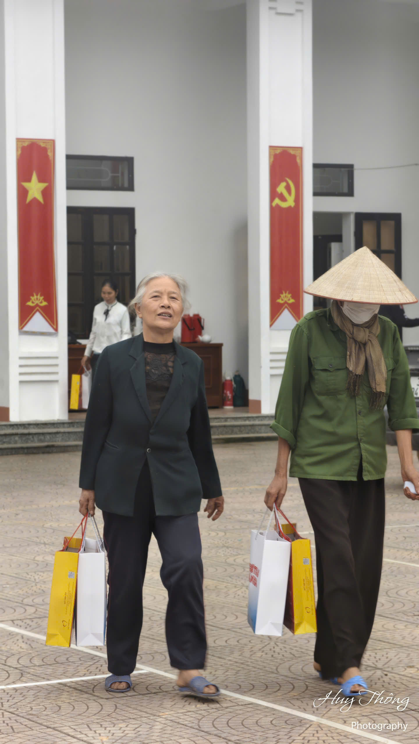 Nhà báo Nguyễn Thiện Thuật cùng đại diện các đơn vị đồng hành và chính quyền xã Hiền Lương trao quà cho các hộ nghèo và hộ có hoàn cảnh đặc biệt khó khăn