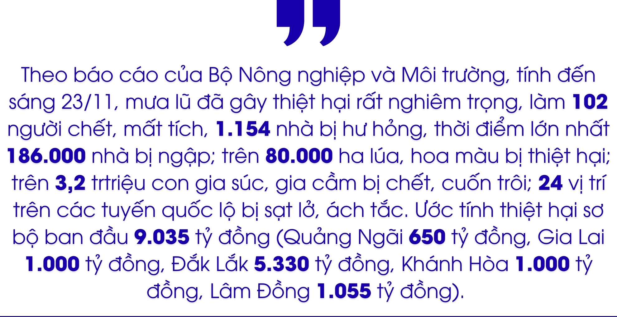 Ngày 22/11/2025, thực hiện phân công của Bộ Chính trị, 4 đoàn công tác của lãnh đạo Đảng, Nhà nước, Chính phủ đã tiếp tục trực tiếp đến các địa phương, trong đó, đồng chí Thường trực Ban Bí thư Trần Cẩm Tú tại Khánh Hòa, Phó Thủ tướng thường trực Nguyễn Hòa Bình tại Đắk Lắk, Bộ trưởng Bộ Quốc phòng Phan Văn Giang tại Gia Lai, Chủ tịnh Ủy ban Trung ương Mặt trận Tổ quốc Việt Nam Bùi Thị Minh Hoài tại Lâm Đồng