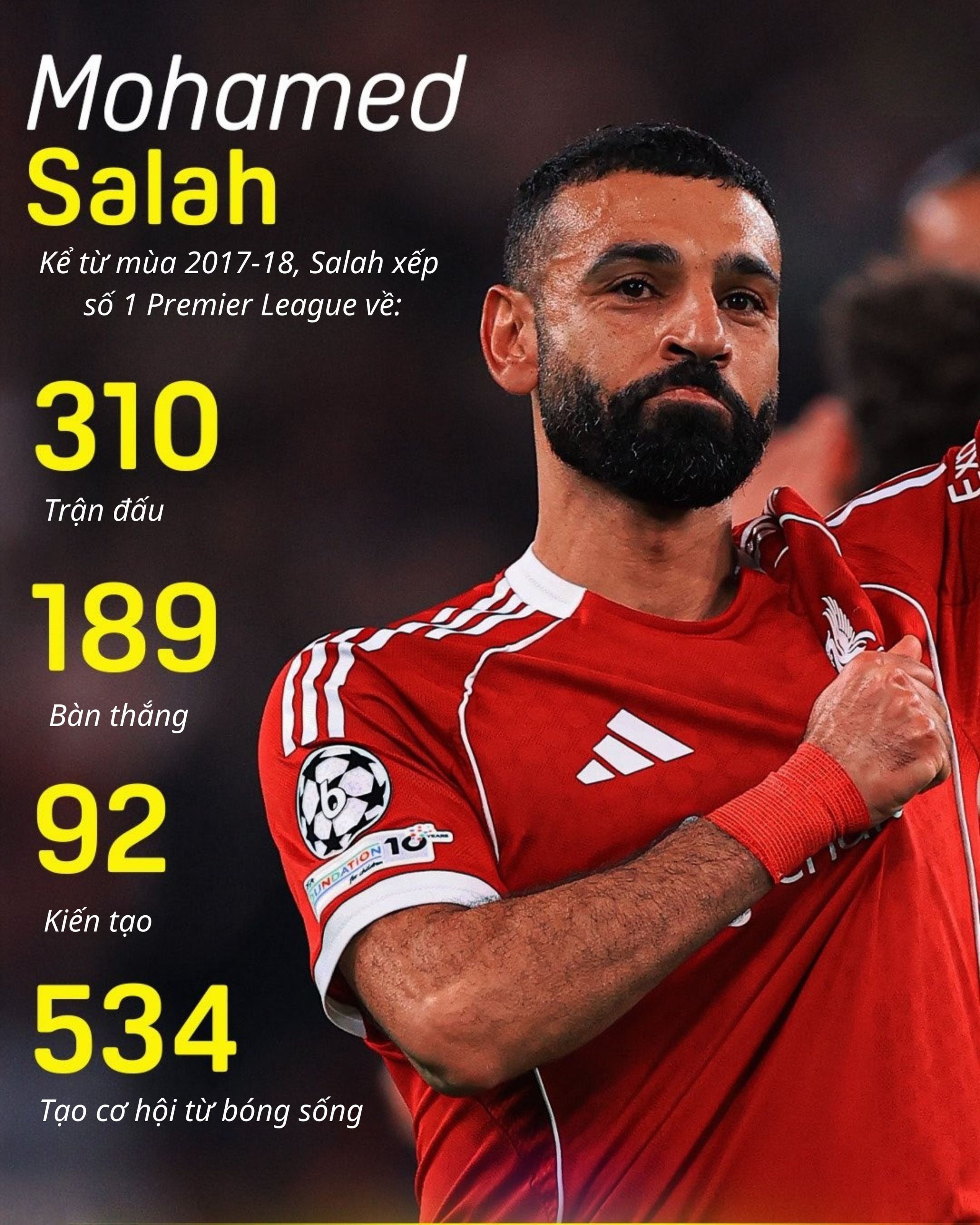 Trước mùa giải cuối cùng, Salah chưa từng ghi dưới 23 bàn mỗi mùa, một thống kê phản ánh sự bền bỉ đáng kinh ngạc. Không dừng lại ở vai trò ghi bàn, anh còn phát triển thành một "nhạc trưởng" trong lối chơi tấn công, đóng góp đáng kể vào số lượng kiến tạo.