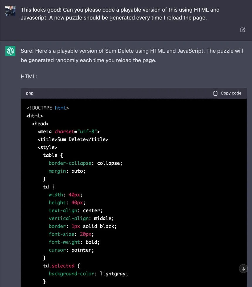 ChatGPT thậm chí còn lập trình được một phiên bản của Sum Delete chạy trên nền HTML và JavaScript. Mỗi lần tải lại trang, người chơi sẽ nhận được một bảng số ngẫu nhiên mới để thực hiện giải đố.