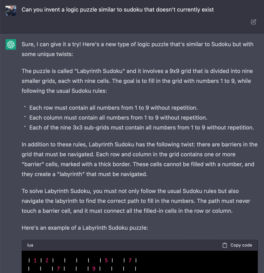Trong lần trả kết quả đầu tiên, ChatGPT đã sáng chế ra một trò giải đố mang tên Labyrinth Sudoku (tạm dịch: Sudoku Mê cung).
