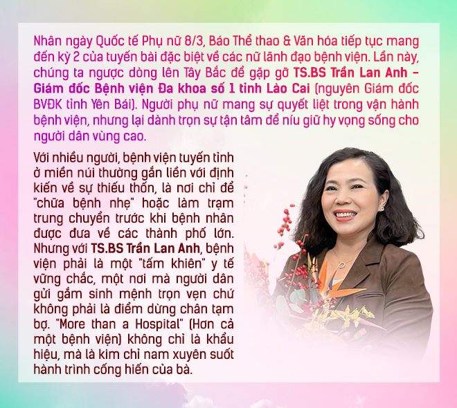 Thế nhưng, những người dân nơi đây hiểu rõ, TS.BS Trần Lan Anh là người đã cần mẫn bồi đắp nên một điểm tựa vững chắc, để mỗi khi ốm đau, họ có thể an tâm trao gửi sinh mệnh ngay trên chính quê hương mình. Câu chuyện về vị nữ Giám đốc là minh chứng lặng thầm cho sức bền của người phụ nữ: Đủ sắc bén trong quản trị, đủ kiên tâm trước khó khăn, và đủ bao dung với từng phận đời yếu thế. Tất cả chỉ để hiện thực hóa một khát vọng duy nhất: Biến nơi chữa bệnh thực sự trở thành 'Hơn cả một bệnh viện'.