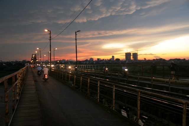 Cảm giác đầu tiên đặt chân lên cầu, thấy người lâng lâng, buồn và có phần không hứng thú. Đêm Long Biên của gần chục năm về trước không lãng mạn và sầm uất như bây giờ. Ánh đèn điện lưa thưa và hiu hắt. Nước sông Hồng lặng lẽ trôi như dải lụa đen tuyền. Hai bên cầu lèo tèo vài chiếc xe máy, xe đạp phóng qua. Những người bán bánh mỳ, bán ngô ngồi uể oải chờ khách… Tất cả như đang mong ngóng một điều gì đó trên cây cầu lịch sử. Cảnh chờ tàu của bố con tôi cũng chẳng kém so những người bán hàng. Cũng uể oải chờ đợi, miệng đã ngáp ngắn ngáp dài. Gió từ sông Hồng thổi vào người mát rượi, thật dễ khiến người ta chìm vào giấc ngủ! Nửa tiếng trôi qua, đường ray xe lửa vẫn im phăng phắc. Bố con tôi vẫn quyết tâm chờ tàu.