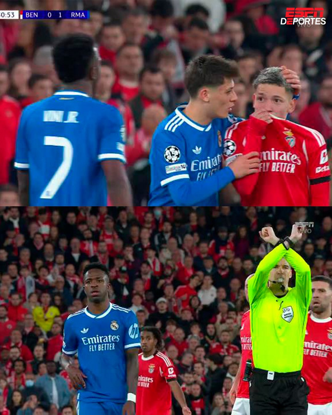 Khoảnh khắc thiên tài của Vinicius lẽ ra phải là tâm điểm của trận lượt đi vòng knock-out. Nhưng chỉ ít giây sau màn ăn mừng có phần khiêu khích khán đài chủ nhà, bầu không khí bỗng đặc quánh. Khi trở về vòng tròn giữa sân, tiền đạo người Brazil tỏ ra phẫn nộ sau cuộc trao đổi với cầu thủ Benfica. Trọng tài Francois Letexier nhanh chóng kích hoạt quy trình chống phân biệt chủng tộc của UEFA bằng động tác khoanh tay trước ngực, và trận đấu bị tạm dừng gần 10 phút.