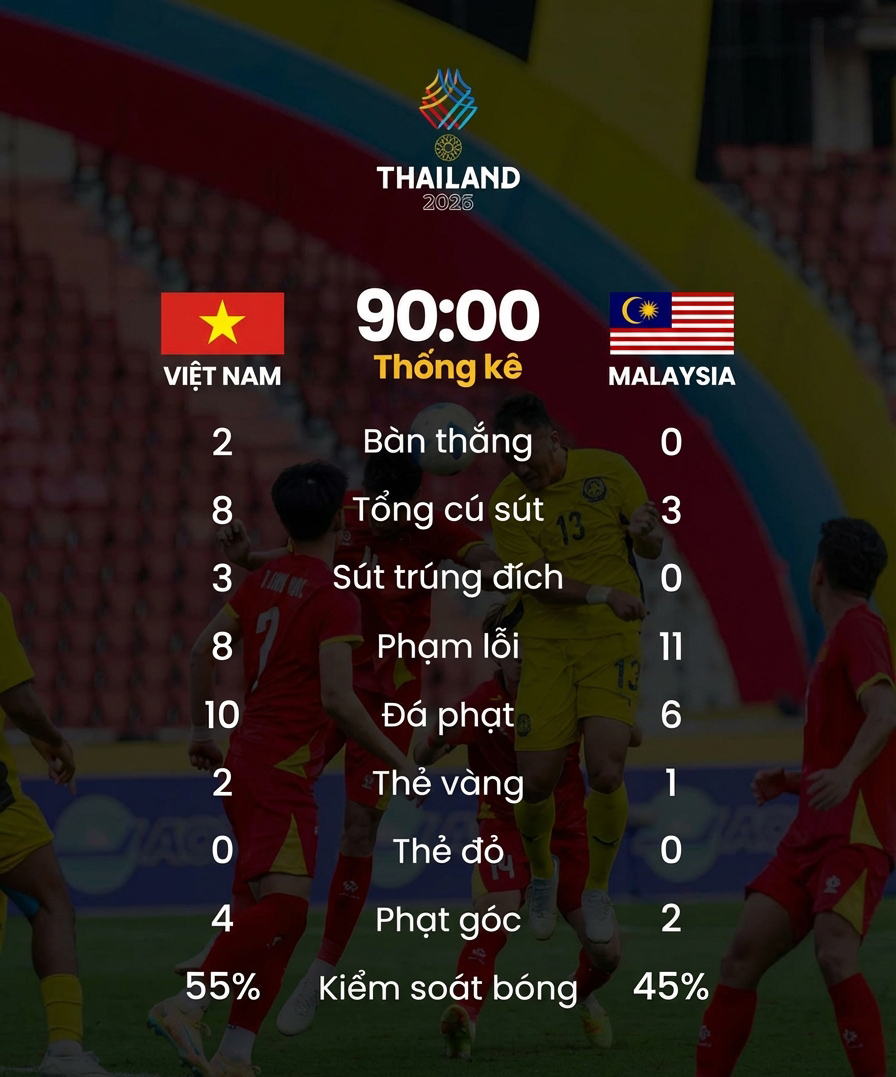 Các thống kê chỉ ra sự áp đảo của U22 Việt Nam. Thầy trò HLV Kim Sang Sik tung ra 8 cú sút, kiểm soát bóng 55%, trong khi U22 Malaysia có 3 pha dứt điểm. Thậm chí trong 90 phút, U22 Malaysia không có pha dứt điểm trúng đích nào. Sức sát thương mà họ tạo ra không đủ để uy hiếp khung thành của Trung Kiên.