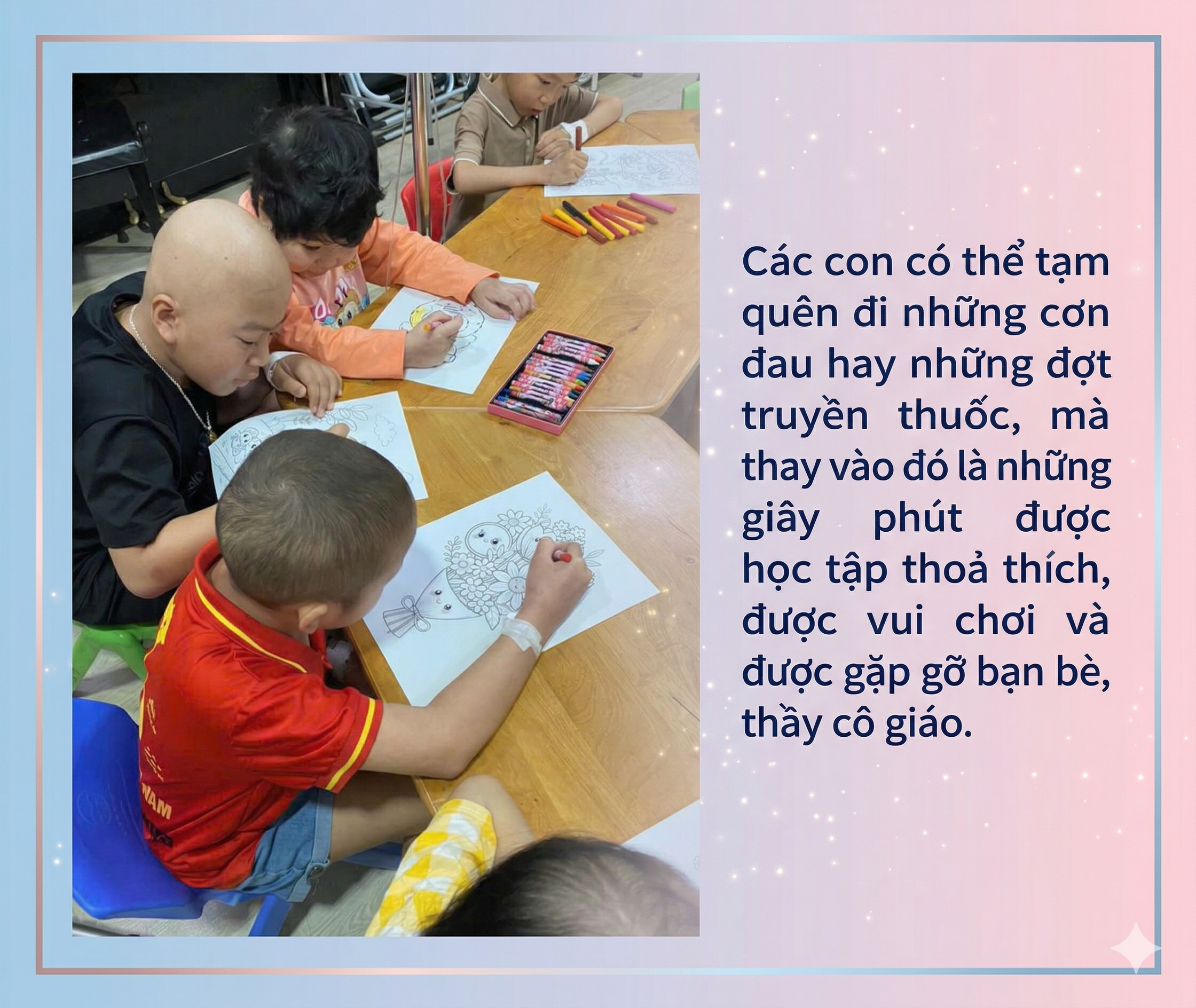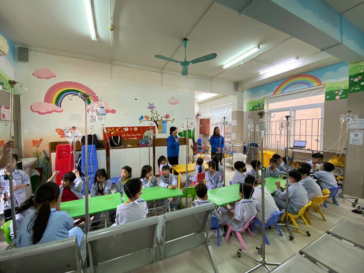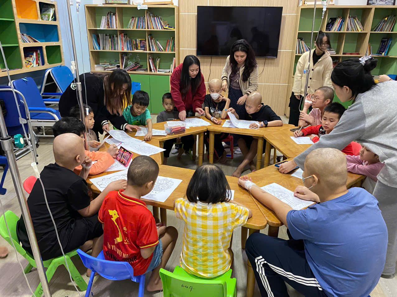 Không chỉ xoa dịu nỗi đau cho người lớn, mạng lưới CTXH tại Viện còn dồn tâm sức để gieo hy vọng cho những bệnh nhi. Tại Trung tâm Thalassemia (tan máu bẩm sinh), nơi các em mang trong mình căn bệnh di truyền gắn liền với những đợt truyền màu định kỳ, một "Lớp học Hạnh phúc" đã được mở ra ngay giữa lòng bệnh viện.