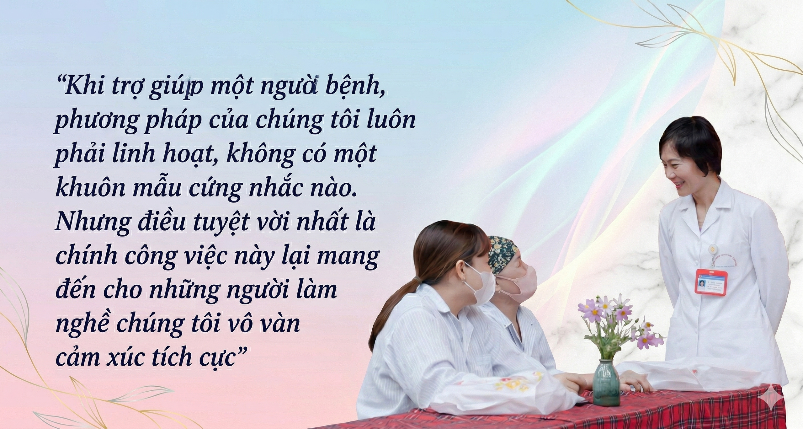 Nhìn lại hành trình gắn bó với nghề, ThS. Lý Thị Hảo bộc bạch: "Khi trợ giúp một người bệnh, phương pháp của chúng tôi luôn phải linh hoạt, không có một khuôn mẫu cứng nhắc nào. Nhưng điều tuyệt vời nhất là chính công việc này lại mang đến cho những người làm nghề chúng tôi vô vàn cảm xúc tích cực". Sự trao đi và nhận lại ấy đã trở thành nguồn năng lượng bền bỉ để họ tiếp tục bám trụ với nghề.