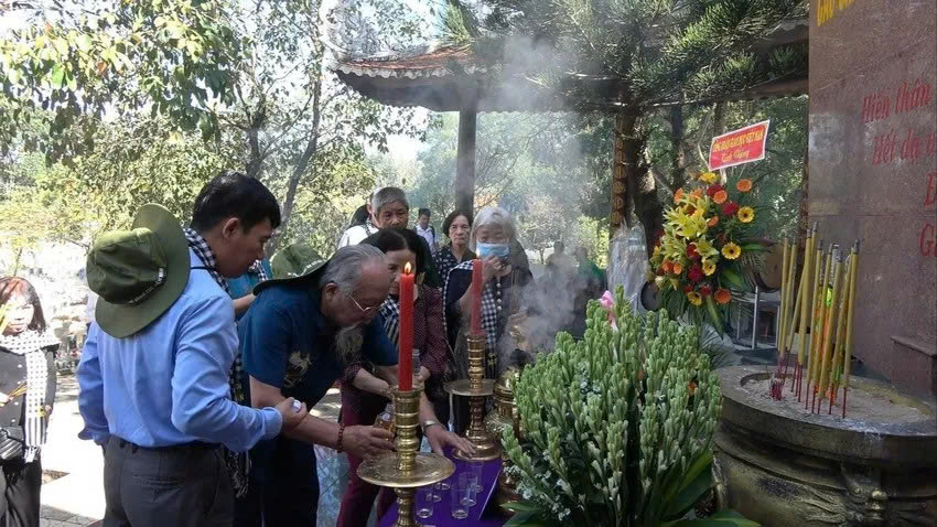 Các cựu giáo sinh, giáo viên dâng hương tưởng niệm các đồng nghiệp đã nằm xuống vì sự nghiệp giáo dục - chống giặc ngoại xâm tại nghĩa trang liệt sĩ Đồi 82 Tân Biên – Tây Ninh. Ảnh: TTXVN