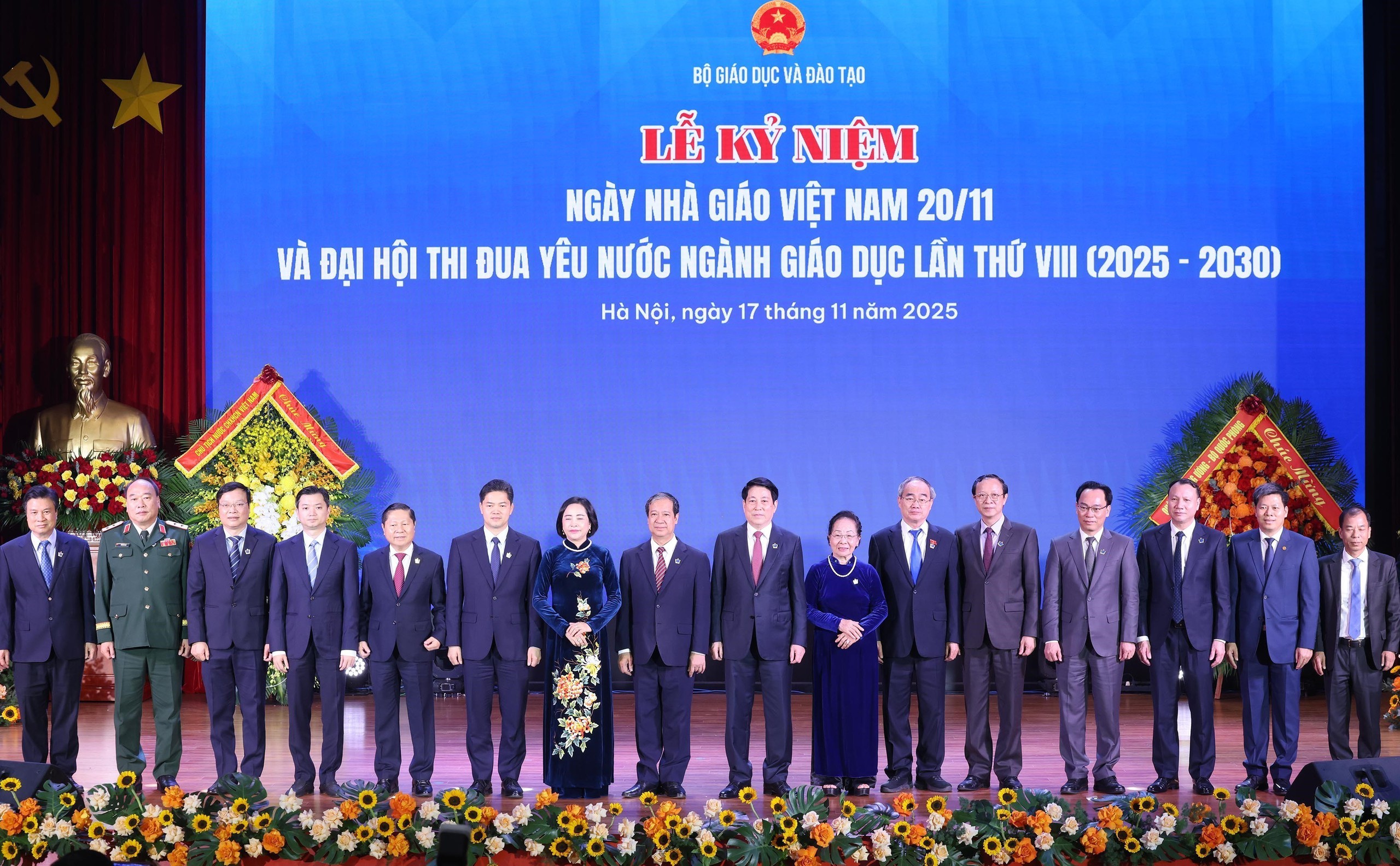 Chủ tịch nước Lương Cường với các đại biểu dự Lễ kỷ niệm Ngày Nhà giáo Việt Nam (20/11) và Đại hội Thi đua yêu nước ngành Giáo dục lần thứ VIII. Ảnh: Lâm Khánh – TTXVN