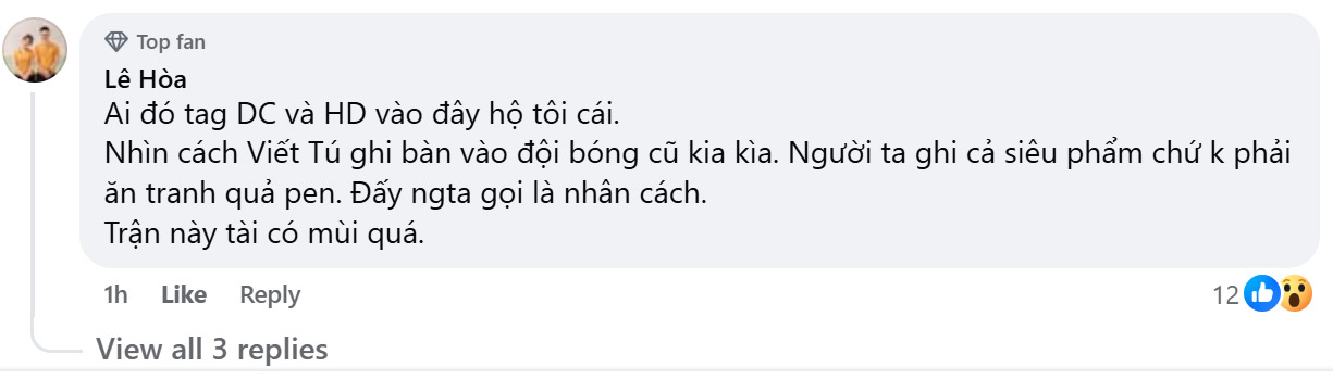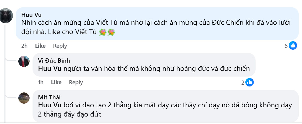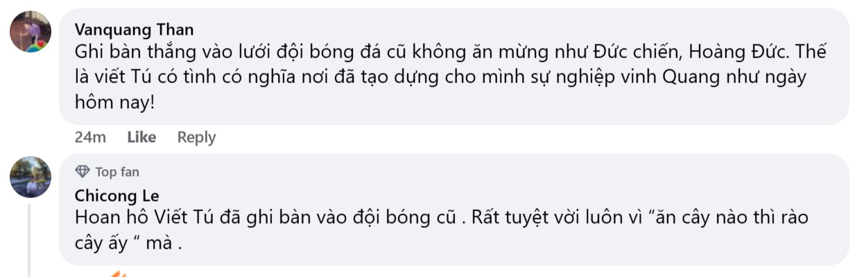 Hành động của Viết Tú trái ngược với màn ăn mừng gây tranh cãi của Đức Chiến cách đây không lâu. Sau khi thực hiện thành công quả phạt đền vào lưới đội bóng cũ, tiền vệ Ninh Bình giơ hai tay lên trời, hét lớn, rồi lao về góc khán đài ăn mừng cuồng nhiệt cùng đồng đội.