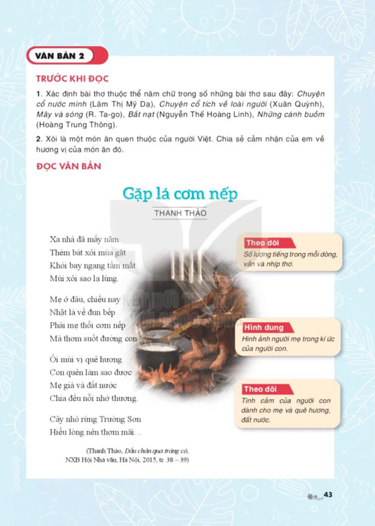 Ngoài Đàn ghi-ta của Lorca, một bài thơ khác của Thanh Thảo là Gặp lá cơm nếp cũng được đưa vào sách giáo khoa. Đây là một bài thơ từ tình cảm và những kỷ niệm ấm áp của tác giả. Ông kể về những năm kháng chiến chống Mỹ, ông cùng đồng đội đi dọc Trường Sơn. Đời lính vất vả và thiếu thốn, nên khi gặp một loại cây rừng có lá thơm mùi cơm nếp, nghe như xung quanh phảng phất mùi xôi, khiến nỗi nhớ nhà, nhớ mẹ tràn về. Bài thơ Gặp lá cơm nếp ra đời với câu từ rất giản dị mà đầm ấm như tình mẹ, như tình quê hương: "Xa nhà đã mấy năm/ Gặp bát cơm mùa gặt/ Khói bay ngang tầm mắt/ Mùi xôi sao lạ lùng.../ Cây nhỏ rừng Trường Sơn/ Hiểu lòng nên thơm mãi".