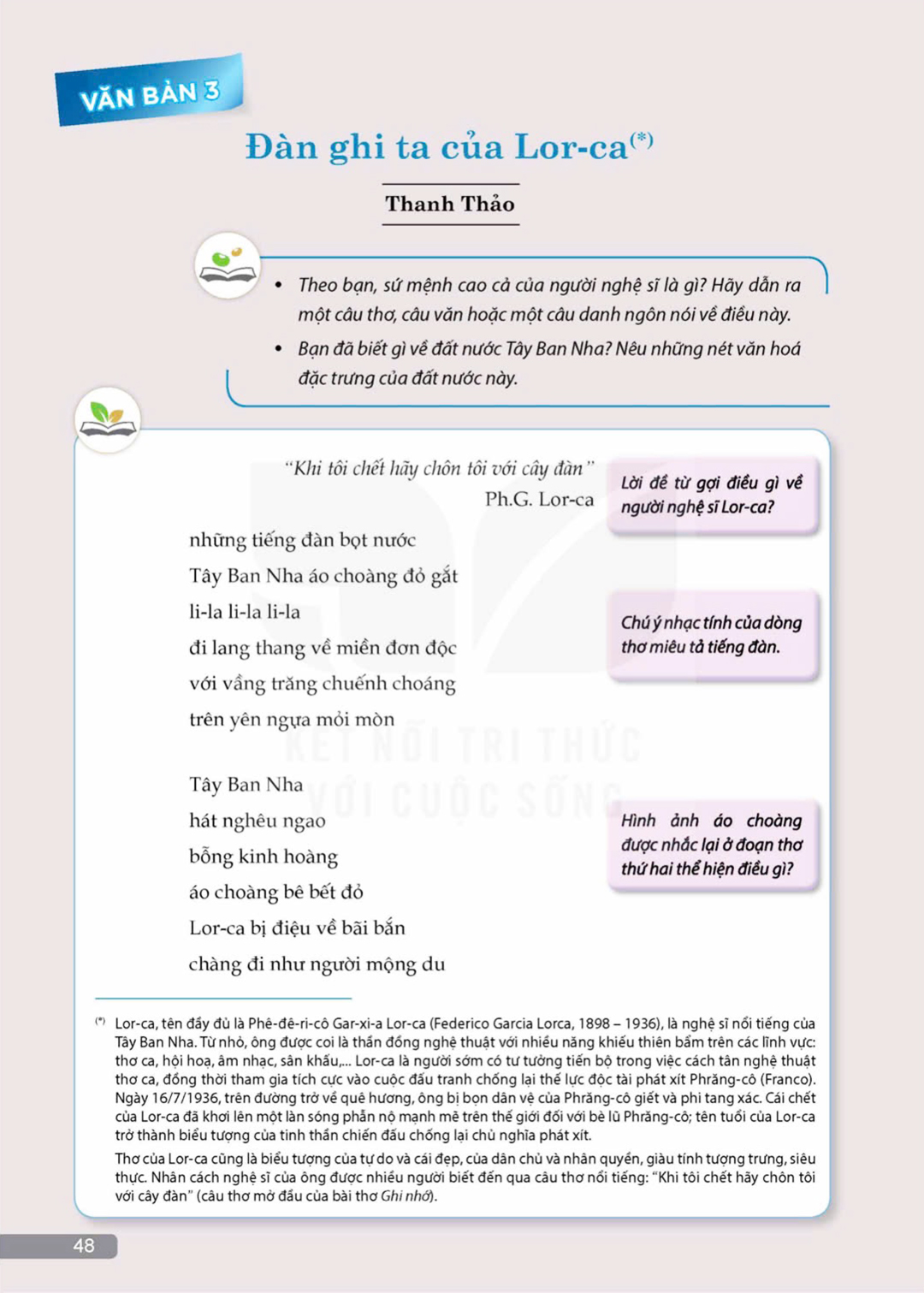 Đúng vậy, một bài thơ hay là phải khiến cho người đọc ngẫm về ý tứ dưới văn bản và mở ra cho họ một không gian lớn hơn. Thanh Thảo rất vui khi bài thơ này được đưa vào sách giáo khoa. Ông trầm ngâm: "Tôi hy vọng rằng, các cháu không chỉ đọc và học một bài thơ, mà từ đó sẽ tìm hiểu thêm vài nét về văn hóa Tây Ban Nha, về nhà thơ Lorca, tìm đọc thơ ông và nuôi dưỡng khát vọng tự do. Tinh thần tự do của con người là điều mà người trẻ nên có ý thức".