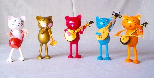 2. Nhưng đáng kể nhất phải là “ban nhạc mèo” gồm 5 con chơi các nhạc cụ truyền thống là đàn tì bà, đàn nguyệt, đàn nhị, kèn, và trống. Ông Tâm kể, ban đêm nghe mèo kêu gào, ông liên tưởng tới chúng đang “tấu nhạc” và thế là ý tưởng về “ban nhạc mèo” ra đời. Đầu và thân mèo thì dễ thôi, làm bằng trứng cút. Khi làm đến đàn nhị (đàn cò) thì với kích cỡ nhỏ xíu của nó, ông phải đi tìm trứng ba ba. Ông lên mạng liên hệ với cơ sở nuôi ba ba để “đặt” mua trứng. Có lẽ chưa bao giờ người giao hàng ba ba nhận được một “yêu cầu” lạ lùng như thế. Và sau khi biết được mục đích của ông Tâm, họ đã vui vẻ “để lại” cho ông 10 quả trứng ba ba giá 30 ngàn đồng, lại tặng thêm cho 10 quả trứng nữa. Trứng ba ba nhỏ hơn trứng cút, tròn xoe như hòn bi, nhưng đục để lấy lòng trứng ra rất khó vì lòng trắng quyện vào vỏ, ông phải hì hục rất mất công mới làm xong...