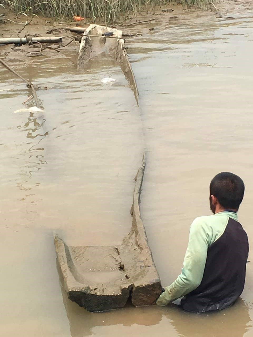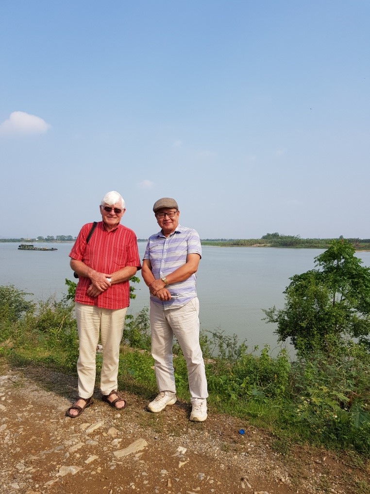 Giáo sư Peter Bellwood và tôi khảo sát trực tiếp nơi vớt được những con thuyền Đông Sơn tại ngã ba sông Kinh Thầy/Kinh Môn (ảnh trái) và cùng trực tiếp vệ sinh, lấy mẫu phân tích gỗ và tuổi C14 trong bể ngâm thuyền tại cơ sở nghiên cứu của Trung tâm Tiền sử Đông Nam Á ở Quảng Yên, Quảng Ninh (hình phải)