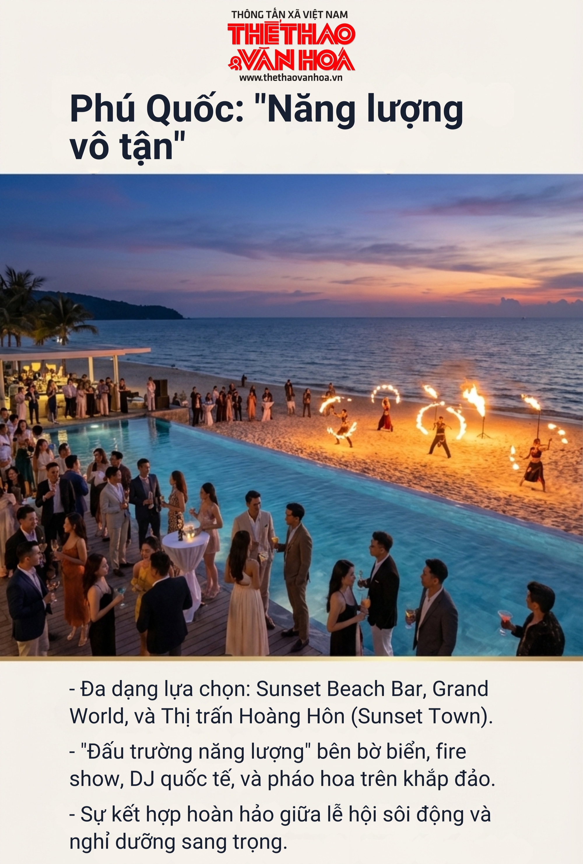 Đảo ngọc Phú Quốc cũng không hề kém cạnh khi biến toàn bộ hòn đảo thành một "thánh đường" của âm nhạc và pháo hoa. Tại Dương Đông, sự kiện "Năng lượng vô tận" tại Sunset Beach Bar sẽ giới thiệu các màn fire show (múa lửa) và DJ quốc tế ngay trên bãi cát.
