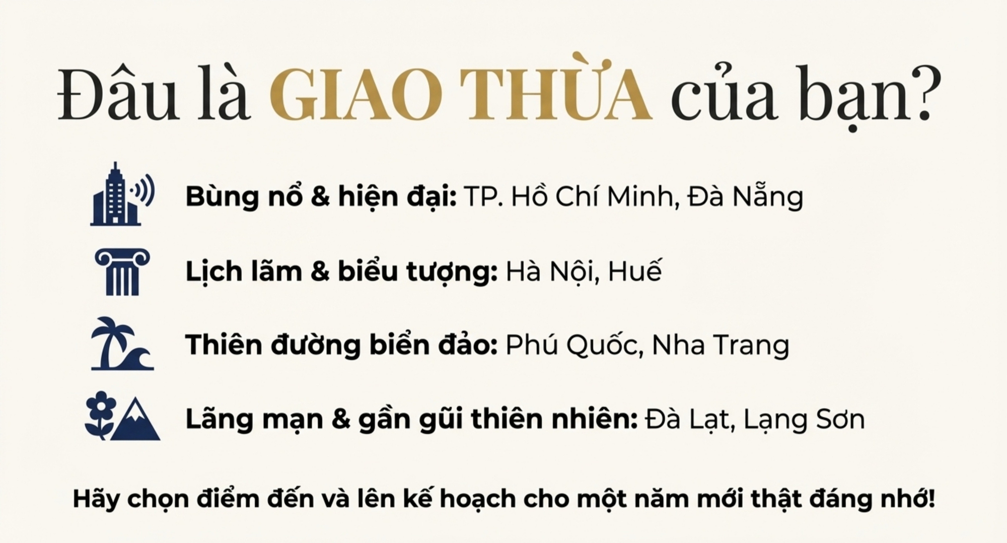 Dù bạn chọn sự náo nhiệt của những đại nhạc hội lớn tại TP. Hồ Chí Minh, Hà Nội hay không khí văn hóa đặc trưng tại Ninh Bình, Tuyên Quang, mỗi điểm đến đều mang lại những cung bậc cảm xúc riêng biệt.